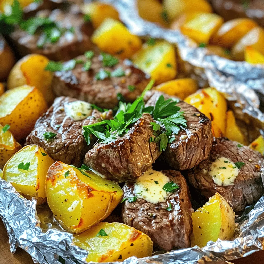 - 1 lb sirloin steak, cut into bite-sized cubes - 4 medium potatoes, diced - 4 tablespoons unsalted butter, melted - 4 cloves garlic, minced The heart of this dish lies in the main ingredients. The sirloin steak gives the packs a rich and hearty flavor. Cut it into bite-sized cubes for quick cooking and easy eating. Next, we have the potatoes. Diced medium, they cook evenly and soak up all the tasty juices. Then, unsalted butter adds a creamy richness. Melting it enhances the flavor of each ingredient. Finally, garlic is a must. Minced fresh, it adds a punch of flavor that shines through. - 1 teaspoon dried rosemary - 1 teaspoon dried thyme - Salt and pepper to taste - Fresh parsley, chopped (for garnish) Seasonings elevate the dish. Dried rosemary gives a woodsy note, while thyme adds a subtle warmth. Don't forget salt and pepper. They enhance all the flavors and make each bite pop. Chopping fresh parsley for garnish adds a bright touch. It makes your packs look and taste fresh. With these ingredients, you set the stage for a delicious meal that impresses everyone. - Preheat your grill or oven to 400°F (200°C). This step helps cook everything evenly. - In a large bowl, mix the cubed steak, diced potatoes, melted butter, minced garlic, dried rosemary, dried thyme, salt, and pepper. Toss until all the pieces are coated well. - Tear off four pieces of aluminum foil, each about 12x12 inches. This size works great for packing. - Divide the steak and potato mixture evenly among the four pieces of foil. Make sure each pack has enough for a good meal. - Fold the edges of the foil over the mixture. Seal the packets tightly to keep the steam inside. No openings should be left! - Place the foil packs on the grill or in the oven. Cook for about 25-30 minutes. Flip them halfway through cooking. Check that the potatoes are tender and the steak is just right. - Carefully take the foil packs from the heat. They will be hot, so use oven mitts! - Open the packets slowly to avoid steam burns. A burst of flavor will greet you! - Garnish each pack with freshly chopped parsley. This adds a nice touch and bright flavor. To ensure even cooking, cut the steak and potatoes into similar sizes. This helps them cook at the same rate. Flip the foil packs halfway through cooking. This action allows heat to reach all sides. Adjust the cooking time based on your taste for steak doneness. If you like it rare, check it at 20 minutes. Feel free to switch up the herbs. Try oregano or basil for a different twist. You can also add spices like paprika or cumin for a kick. Adding veggies like bell peppers or zucchini boosts flavor and nutrients. Mix in chopped onions for added sweetness and depth. Always use caution when handling hot foil packs. The steam inside can be very hot. Open the packs slowly to let steam escape safely. Ensure the packets are sealed tightly. This keeps the steam inside for perfect cooking. {{image_2}} If you want a twist, try using chicken or shrimp instead of steak. Chicken thighs work well because they stay juicy. Shrimp cooks fast, so check it often. For a vegetarian option, swap the steak with hearty veggies like mushrooms or tofu. Both choices keep the foil pack fun and tasty. Adding different sauces can change the dish's taste. A splash of soy sauce gives a savory kick. You can also try barbecue sauce for a sweet touch. Experimenting with spices adds depth. Use smoked paprika for warmth or chili powder for heat. This way, you can make each pack special. Don’t hesitate to add more veggies! Onions bring sweetness, while bell peppers add color. Carrots add crunch and sweetness too. Seasonal veggies like zucchini or asparagus can brighten the pack. Mixing various vegetables not only boosts flavor but also makes your meal colorful and healthy. To store your Garlic Butter Steak & Potato Foil Packs, first let them cool. This helps keep them fresh. Avoid putting hot food directly into the fridge. Use shallow containers for quick cooling. Then, place the leftovers in airtight containers. This keeps flavors locked in. Label the containers with the date to track freshness. You can reheat these foil packs in two ways: the oven or the microwave. For the oven, preheat to 350°F (175°C). Place the foil pack on a baking sheet. Heat for about 15-20 minutes. This method keeps the flavor strong. If using a microwave, place the pack on a microwave-safe plate. Heat for 3-5 minutes. Be careful, as the steam can be hot. Reheating in the oven usually maintains the best texture. If you want to freeze the cooked foil packs, let them cool first. Wrap each pack tightly in plastic wrap. Then, place them in a freezer-safe bag. This helps prevent freezer burn and keeps them fresh. For thawing, move the foil packs to the fridge the night before. You can also let them sit at room temp for about an hour. This helps them thaw evenly. Yes, you can make these foil packs ahead. Prepare the steak and potato mixture. Place the mixture in the foil and seal it. Store the sealed packs in the fridge for up to 24 hours. This saves time for busy days. When ready to cook, just place them on the grill or in the oven. If you are using a campfire, cook the foil packs for about 15-20 minutes. Place them on hot coals or a grill grate. Make sure to flip the packs halfway through. This helps cook the steak and potatoes evenly. Always check that the steak is cooked to your liking and the potatoes are tender. These foil packs pair well with many sides. You can serve them with a fresh salad. A simple green salad adds crunch and freshness. Grilled veggies are also a great choice. Consider corn on the cob or asparagus for extra flavor. Don’t forget a nice crusty bread to soak up the garlic butter! Garlic Butter Steak & Potato Foil Packs are easy and tasty. This meal combines sirloin steak, potatoes, and garlic butter with simple seasonings. You can customize it with different proteins and veggies. Follow my step-by-step guide to perfect your cooki