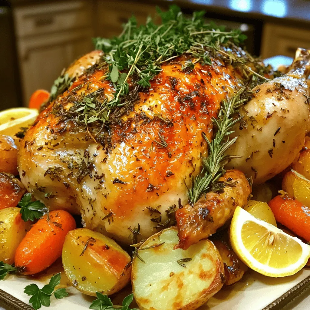![- Whole chicken (4-5 lbs) - Fresh herbs: rosemary, thyme, parsley - Olive oil and garlic - Vegetables: onion, carrots, potatoes - Seasoning essentials: lemon, salt, and pepper To make savory herb roasted chicken, you need simple, fresh ingredients. Start with a whole chicken. A bird weighing 4-5 pounds works best. Next, gather fresh herbs. I love using rosemary, thyme, and parsley. They add great flavor and aroma. Olive oil and garlic also play key roles. They help create a rich, tasty crust. For vegetables, use onion, carrots, and potatoes. They roast well and soak up the chicken's juices. Add seasoning essentials like lemon, salt, and pepper. Lemon brightens the dish and makes it zesty. This recipe uses fresh ingredients to ensure a juicy and flavorful chicken. You can find the full recipe above, which guides you through each step. Enjoy your cooking! Start by cleaning the chicken. Rinse it under cold water and pat it dry with paper towels. This step is key for a crispy skin. Next, make your herb paste. In a small bowl, mix olive oil, chopped rosemary, thyme, parsley, minced garlic, lemon zest, salt, and pepper. This paste will bring great flavor. Now, loosen the skin on the chicken breast and thighs. You can do this by gently sliding your fingers under the skin. Be careful not to tear it. Once you loosen the skin, rub the herb paste under the skin and over the chicken. Make sure every part gets some love. Then, stuff the cavity with the quartered lemon. This adds moisture and flavor. In a roasting pan, arrange the onion, carrots, and potatoes in a single layer. Place the chicken on top, breast side up. Now, roast the chicken in your preheated oven at 425°F (220°C) for about 1 hour and 15 minutes. It's done when the internal temperature hits 165°F (75°C) in the thickest part of the thigh. The skin should be golden and crispy. Halfway through cooking, baste the chicken with the pan juices. This keeps it juicy. After cooking, let the chicken rest for 10 to 15 minutes before carving. This helps the juices settle. Enjoy your savory herb roasted chicken! For more details, check out the Full Recipe. Basting is key to keeping your chicken juicy. Baste the chicken halfway through cooking. This adds flavor and moisture. Use the pan juices to soak the skin. Doing this step helps the chicken stay tender and gives it a nice color. Letting the chicken rest is very important. After you take it out of the oven, let it sit for 10-15 minutes. This allows the juices to settle. If you cut it right away, those juices run out. You want every bite to be juicy and full of flavor. To boost the taste, try adding different spices. You can use smoked paprika for a hint of smoke. A bit of lemon juice can add brightness. Feel free to experiment with marinades too. Soy sauce or honey can make nice glazes. These ideas give your chicken a unique twist. For more details, check the Full Recipe. {{image_2}} You can mix and match herbs to create your own flavor. Rosemary, thyme, and parsley work well together. If you want a twist, try oregano or sage. Each herb adds its own taste. Oregano gives a warm, earthy flavor. Sage adds a hint of woodiness. This keeps your dish exciting and unique. Roasting is classic, but other methods work, too. You can use a slow cooker for a tender chicken. Just put everything in, set it, and walk away. An air fryer is another great option. It cooks fast and gives crispy skin without tons of oil. Each method offers its own benefits, so try what you like best. Feel free to swap out sides or add flavors. Instead of carrots and potatoes, try sweet potatoes or Brussels sprouts. You can even add a splash of balsamic vinegar for a tangy bite. This recipe is flexible, so get creative! Mix in your favorite flavors for a dish that feels personal. For the full recipe, check the earlier section. Store leftover chicken in an airtight container. This keeps it fresh and safe to eat. Make sure to refrigerate your chicken within two hours of cooking. It helps prevent harmful bacteria growth. If you have any herbs left, store those separately to maintain their flavor. To freeze your chicken, first let it cool completely. Wrap it tightly in plastic wrap, then place it in a freezer-safe bag. This extra layer helps prevent freezer burn. When you are ready to eat it again, thaw it in the fridge overnight. Reheat it in the oven at 350°F (175°C) until it's hot all the way through. For best quality, eat refrigerated chicken within three to four days. If frozen, it’s best to use it within four months. After that, it may still be safe to eat, but the quality may drop. Always check for any off smells or changes in texture before eating. Following these steps ensures you enjoy every bite of your savory herb roasted chicken from the [Full Recipe]. Roasting a chicken takes about 20 minutes per pound. For a 4-5 pound chicken, that means roughly 1 hour and 15 minutes. Always check the size of your chicken. Some ovens may cook faster or slower. Use a meat thermometer to ensure accuracy. The chicken is ready when it reaches an internal temperature of 165°F (75°C) in the thickest part of the thigh. Yes, you can use dried herbs, but the flavor will change. Dried herbs are more potent than fresh ones. Use about one-third the amount when switching. For example, if the recipe calls for 2 tablespoons of fresh herbs, use about 1 tablespoon of dried herbs. This change will still give you a nice flavor, but fresh herbs bring a brighter taste. The best way to know if your chicken is done is to check its internal temperature. Use a meat thermometer to measure the temperature in the thigh, not touching the bone. It should read 165°F (75°C). This ensures the chicken is safe to eat. Also, the juices should run clear when you cut into it. Enjoy your perfectly juicy chicken! This post covered how to roast a whole chicken perfectly. We discussed the ingredients, from fresh herbs to essential vegetables. I provided step-by-step in