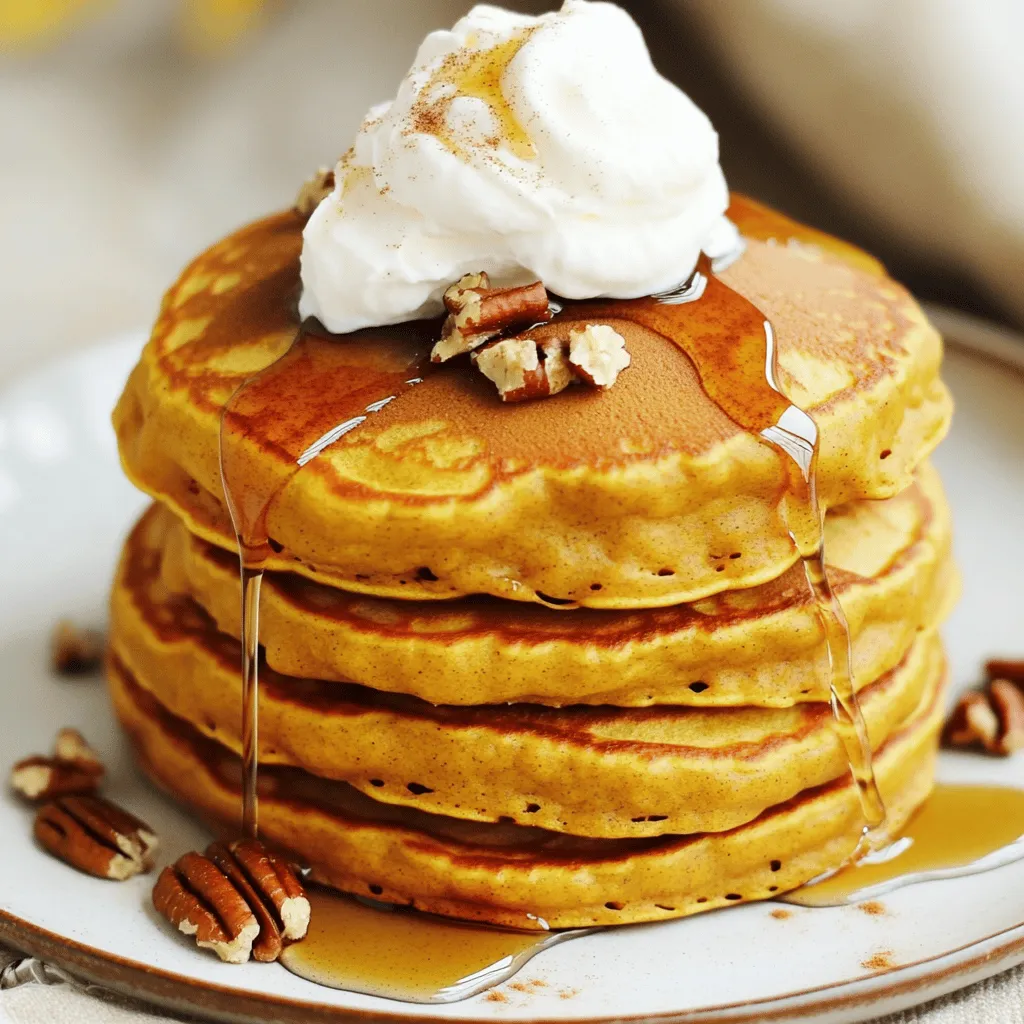 To make these tasty pumpkin spice pancakes, you need some key ingredients. Here is what you will need: - 1 cup all-purpose flour - 2 tablespoons brown sugar - 1 teaspoon baking powder - 1/2 teaspoon baking soda - 1/2 teaspoon salt - 1 teaspoon ground cinnamon - 1/2 teaspoon ground nutmeg - 1/4 teaspoon ground ginger - 1/4 teaspoon ground cloves - 1 cup pumpkin puree (canned or fresh) - 1 large egg - 1 cup milk (dairy or non-dairy) - 2 tablespoons melted butter (or coconut oil) - 1 teaspoon vanilla extract These ingredients work together to create soft, warm pancakes. They have a rich flavor thanks to the pumpkin and spices. You can dress up your pancakes with fun toppings. Here are some ideas: - Maple syrup - Whipped cream - Cinnamon sugar - Chopped nuts, like pecans or walnuts - Fresh fruit, like bananas or berries These toppings add extra sweetness and texture. You can mix and match them based on your taste. If you need to swap some items, here are some great substitutions: - Use whole wheat flour for a healthier option. - Replace brown sugar with coconut sugar for a different flavor. - Almond milk or oat milk can work instead of regular milk. - Applesauce can replace butter for a lower-fat option. These substitutions keep the recipe easy and tasty, ensuring you can enjoy pumpkin spice pancakes any time. For the full recipe, check the detailed instructions above. 1. Start by gathering your ingredients. You will need: - 1 cup all-purpose flour - 2 tablespoons brown sugar - 1 teaspoon baking powder - 1/2 teaspoon baking soda - 1/2 teaspoon salt - 1 teaspoon ground cinnamon - 1/2 teaspoon ground nutmeg - 1/4 teaspoon ground ginger - 1/4 teaspoon ground cloves - 1 cup pumpkin puree - 1 large egg - 1 cup milk - 2 tablespoons melted butter - 1 teaspoon vanilla extract 2. In a medium bowl, whisk together the dry ingredients. Mix the flour, brown sugar, baking powder, baking soda, salt, and spices until they are well combined. 3. In a larger bowl, mix the wet ingredients. Add the pumpkin puree, egg, milk, melted butter, and vanilla extract. Stir until you have a smooth blend. 4. Gradually add the dry mix to the wet mix. Stir gently until just combined. A few lumps are okay; don’t overmix! - Preheat your skillet over medium heat. A non-stick skillet works best. - Lightly grease the skillet with butter or cooking spray to prevent sticking. - Use about 1/4 cup of batter for each pancake. Pour it onto the skillet. - Watch for bubbles on the surface. This usually takes 2-3 minutes. - Flip the pancake carefully. Cook for another 1-2 minutes until golden brown. 1. Mixing Ingredients: Show your mixing bowls, with dry ingredients on one side and wet on the other. 2. Batter Consistency: Display the batter’s texture. It should be thick but pourable. 3. Cooking: Capture the moment when bubbles form. This indicates it’s time to flip! 4. Final Presentation: Stack your pancakes high, drizzle with syrup, and top with whipped cream. Garnish with a sprinkle of cinnamon for that extra touch. For the full recipe, refer to the earlier section. Enjoy making your savory pumpkin spice pancakes! To boost flavor in your pumpkin spice pancakes, use fresh spices. Freshly ground spices give a stronger taste. You can also add a pinch of salt to enhance sweetness. Using high-quality pumpkin puree makes a big difference, too. If you want more depth, mix in some vanilla extract. It adds warmth and richness. Lastly, serve your pancakes with pure maple syrup for a tasty touch. Sometimes pancakes can turn out dense. This happens when you overmix the batter. Stir gently until ingredients just blend. If your pancakes are too flat, check your baking powder. It should be fresh. Also, make sure your skillet is hot enough. If pancakes stick, try using more butter or cooking spray. If they burn, lower the heat and cook longer. Store leftover pancakes in an airtight container. They stay fresh in the fridge for up to three days. For longer storage, freeze them. Place parchment paper between pancakes to prevent sticking. Warm them up in the toaster or microwave. Enjoy your pancakes again without losing flavor or texture. For the full recipe, check out the complete guide. {{image_2}} You can change the flavor of your pumpkin spice pancakes easily. Here are some fun ideas: - Chocolate Chip: Add a handful of chocolate chips to the batter for a sweet touch. - Apple Cinnamon: Mix in small apple pieces and a bit more cinnamon. - Maple Pecan: Stir in chopped pecans and use maple extract instead of vanilla. Each of these variations adds a unique taste to the pancakes while keeping the pumpkin flavor intact. You can still enjoy pumpkin spice pancakes if you need gluten-free or vegan recipes. Here’s how: - Gluten-Free: Use gluten-free flour instead of all-purpose flour. Almond or oat flour works great. - Vegan: Replace the egg with a flax egg (1 tablespoon ground flaxseed mixed with 2.5 tablespoons water) and use non-dairy milk. These simple swaps keep the pancakes delicious and inclusive for everyone. You can make your pancakes even more fun with add-ins. Here are some ideas: - Nuts and Seeds: Chopped walnuts, almonds, or sunflower seeds add crunch. - Dried Fruits: Raisins or cranberries bring sweetness and chewiness. - Spices: Try adding a pinch of cardamom or allspice for extra warmth. These creative touches will make your pumpkin spice pancakes unique and enjoyable. For a complete recipe, check out the Full Recipe mentioned earlier. If you have leftover pancake batter, store it in a clean, airtight container. Make sure to cover it well to keep out air. You can keep it in the fridge for up to two days. When you're ready to cook, stir the batter gently to mix it again. For pancakes you don't eat right away, let them cool completely first. Then, stack them with parchment paper in between to prevent sticking. Place them in a freezer bag or airtight container. You can freeze pancakes for up to three months. This way, you can enjoy a tasty br