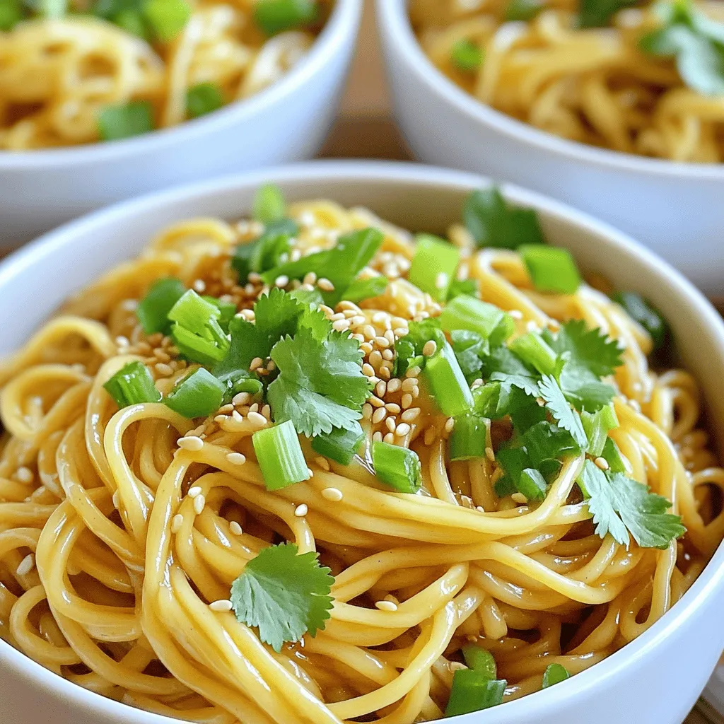 ![To make Sesame Garlic Noodles, gather these fresh and flavorful ingredients. Each one plays a key role in creating this tasty dish. - Noodles and Bases - 8 oz. egg noodles: These are soft and absorb flavors well. - Sauces and Seasonings - 3 tablespoons sesame oil: This adds a nutty taste. - 4 cloves garlic, minced: Fresh garlic gives a strong flavor. - 2 tablespoons soy sauce: It adds saltiness and umami. - 1 tablespoon rice vinegar: This brings a light tang. - 1 tablespoon honey or maple syrup: This balances the flavors with sweetness. - 1 teaspoon red pepper flakes: Use these to control the spice level. - Garnishes and Extras - 2 green onions, chopped: They add a fresh crunch. - 1 tablespoon sesame seeds (toasted): These provide texture and extra flavor. - Fresh cilantro for garnish: This adds a bright finish. With this Full Recipe, you're ready to create a delicious meal that is quick and easy! 1. Boiling Techniques: Fill a large pot with water. Add a pinch of salt. Bring it to a rolling boil. 2. Timing for Al Dente: Add the egg noodles to the pot. Cook them for about 6 to 8 minutes. Check the package for specific timing. You want them firm but not hard. 3. Draining and Setting Aside: Once cooked, drain the noodles in a colander. Rinse them briefly with cold water to stop cooking. Set them aside to cool. 1. Mixing Techniques: Grab a small bowl. Add sesame oil, minced garlic, soy sauce, rice vinegar, and honey. Mix it all well with a whisk or a fork. 2. Adjusting Sweetness and Spice: Taste the sauce. If you want it sweeter, add more honey. For more spice, toss in some red pepper flakes. 1. Cooking Methods: Heat a large skillet over medium heat. Add the cooked noodles to the skillet. 2. Achieving the Perfect Coat: Pour the sauce over the noodles. Use tongs to toss the noodles until they are evenly coated. 1. Recommended Garnishes: Once the noodles are heated through, stir in chopped green onions and sesame seeds. 2. Final Touches: Taste the noodles again. If needed, add a splash of soy sauce. Serve on plates and top with fresh cilantro for a bright finish. - Best Practices for Leftovers After enjoying your sesame garlic noodles, let them cool down. Store them in an airtight container. They last up to three days in the fridge. Avoid leaving them out for too long to keep them fresh. - Reheating Techniques When you want to enjoy leftovers, heat them on the stove. Add a splash of water or oil to help them steam. Stir often to avoid sticking. You can also use the microwave, but cover the dish to keep moisture in. - How to Cook Perfect Noodles Use a large pot with plenty of salted water. Bring it to a rolling boil before adding the noodles. Cook them until they are al dente. This means they should be firm but not hard. Drain the noodles right away to stop the cooking. - Enhancing Flavor Profiles To boost the taste, try adding fresh herbs like cilantro or basil. You can also sprinkle more sesame seeds on top. If you like spice, add more red pepper flakes. Taste your dish as you go. Adjust the soy sauce to suit your flavor. - Alternative Noodles If you want a different base, try rice noodles or whole wheat noodles. They cook slightly differently, so check the package instructions. You can also use zoodles (zucchini noodles) for a low-carb option. - Vegan Options To make this dish vegan, use maple syrup instead of honey. Ensure your soy sauce is labeled as vegan. You can also add tofu for protein. Cook the tofu until golden before mixing it in with the noodles. For the full recipe, refer to the earlier section. Enjoy your cooking! {{image_2}} You can easily add protein to your sesame garlic noodles. Options like chicken, tofu, or shrimp work well. For chicken, use thin strips and cook them in the skillet first. For tofu, opt for firm tofu and cube it. Sauté the tofu until golden for extra flavor. If you prefer shrimp, add them to the skillet until they turn pink. Each choice adds taste and makes the dish more filling. Incorporating seasonal vegetables can elevate your dish. Try bell peppers, broccoli, or snap peas for color and crunch. Chop the veggies into bite-sized pieces. Sauté them in the skillet for a few minutes before adding the noodles. This way, they cook evenly and stay crisp. Feel free to mix and match your favorite vegetables for variety. If you're a fan of heat, adjust the spice level easily. Start with more red pepper flakes for a kick. You can also add chili oil for another layer of heat. For a unique twist, try incorporating sliced jalapeños or sriracha. Adjust the spice until it fits your taste. It’s your dish, so make it as spicy as you like! When storing your sesame garlic noodles, follow these simple steps: - Refrigeration Tips: Place leftovers in an airtight container. Keep them in the fridge. They will stay fresh for a few days. Make sure to cool them before sealing the container to prevent moisture buildup. - Freezing Methods: If you want to save them longer, freezing is a great option. Place the cooled noodles in a freezer-safe bag. Remove as much air as possible to avoid freezer burn. They can last up to three months in the freezer. - How Long It Lasts in the Fridge: Sesame garlic noodles can last about 3 to 5 days in the fridge. Always check for freshness before eating. - Signs of Spoilage: Look for changes in color or smell. If the noodles smell sour or look slimy, it’s best to throw them away. Staying safe is key! By following these storage tips, you can enjoy your sesame garlic noodles later without worry. For the full recipe, check out the [Full Recipe]. Sesame garlic noodles are a simple yet tasty dish. They feature egg noodles tossed in a savory sauce. This sauce blends sesame oil, garlic, soy sauce, and a hint of sweetness. The result is a flavorful meal that is both satisfying and comforting. You can add veggies or protein to make it heartier. The dish is popular in many Asian cuisines and is loved for its rich taste and quick preparation. Yes, you can