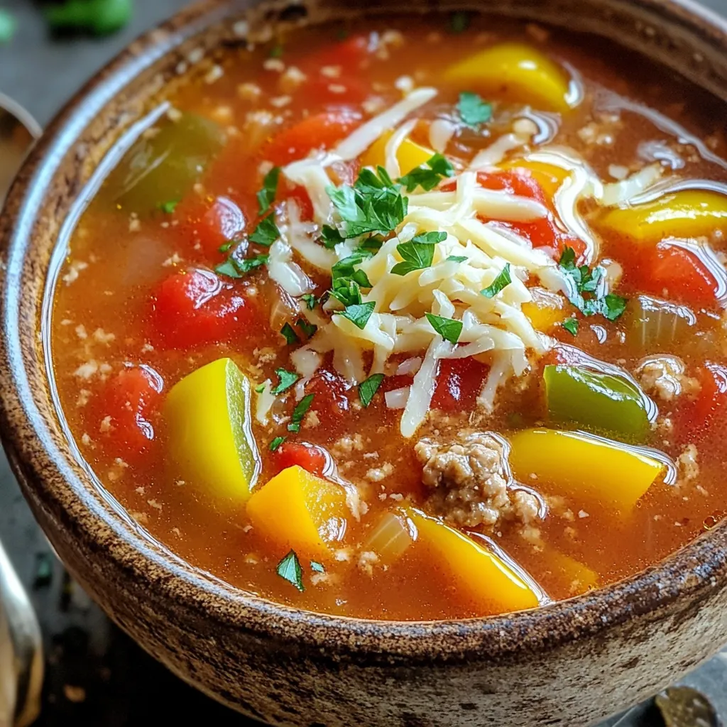 These ingredients come together to create a warm and filling soup. The bell peppers give a nice color and sweetness. The ground turkey or beef adds protein, while the quinoa or rice makes it hearty. I love using crushed tomatoes for their rich flavor, and the broth ties everything together. The Italian seasoning and smoked paprika bring depth to the dish. Top it off with cheese and parsley for a lovely finish!