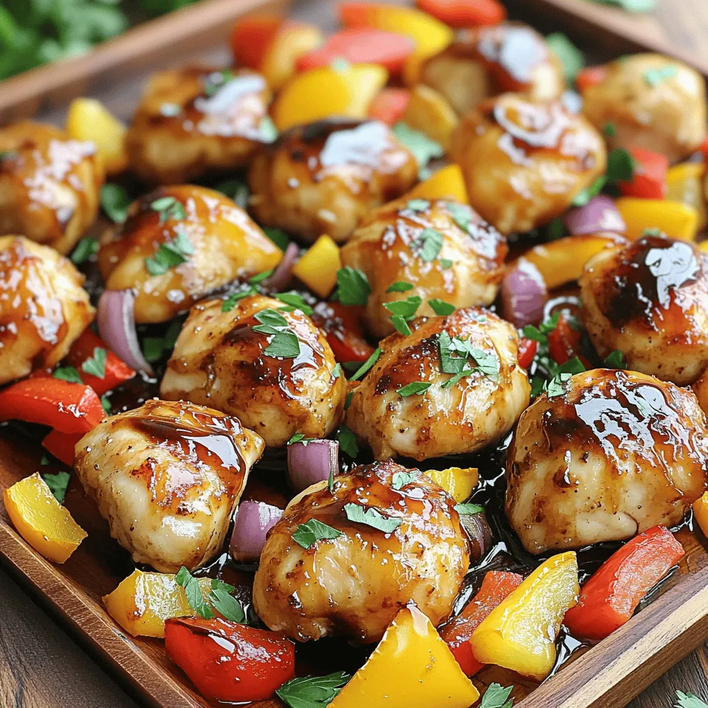 - 1.5 lbs boneless chicken breast, cut into bite-sized pieces - 1/4 cup balsamic vinegar - 1/4 cup honey - 2 tablespoons olive oil - 3 garlic cloves, minced - 1 teaspoon Dijon mustard - 1/2 teaspoon black pepper - 1 teaspoon salt - 1 teaspoon dried rosemary - 1 teaspoon dried thyme - 1 red bell pepper, diced - 1 yellow bell pepper, diced - 1 small red onion, cut into wedges The main star of this dish is the chicken. I use boneless chicken breast because it cooks evenly and stays juicy. The bite-sized pieces allow for quick cooking and easy eating. Next, we have the marinade components. The balsamic vinegar and honey work together to create a sweet and tangy flavor. Olive oil helps to keep the chicken moist. Garlic adds a lovely aroma, while Dijon mustard gives a little kick. The dried herbs, rosemary and thyme, add depth to the taste. Finally, the vegetables are key to this dish. I use colorful bell peppers and red onion. They add flavor and texture. Plus, they look great on the sheet pan. - Fresh parsley for garnish Garnishing with fresh parsley adds a pop of color and freshness. It also brightens the flavor. You can serve this dish with a side of rice or a green salad. They balance the sweetness of the chicken and veggies nicely. Preheating the oven Start by setting your oven to 400°F (200°C). This will ensure your chicken cooks evenly and quickly. Preheating helps to achieve that nice caramelization on the chicken and veggies. Preparing the marinade In a mixing bowl, combine the balsamic vinegar, honey, and olive oil. Add minced garlic, Dijon mustard, black pepper, salt, dried rosemary, and dried thyme. Whisk these ingredients together well. This marinade is key to giving your chicken bites a rich flavor. Marinating time Once your marinade is ready, add the bite-sized chicken pieces. Toss the chicken to coat evenly. Let it marinate for about 15 minutes. This short wait helps the flavors soak in and makes the chicken taste amazing. Arranging ingredients on the sheet pan While the chicken marinates, prepare your veggies. Dice the red and yellow bell peppers and cut the red onion into wedges. After marinating, take the chicken and place it on one side of the baking sheet. Leave space for the veggies. On the other side, add the bell peppers and onion. Drizzle a bit of olive oil over the veggies and sprinkle with salt and pepper. Baking instructions Bake everything in the preheated oven for 20-25 minutes. The chicken is done when it reaches 165°F (75°C) and the veggies are tender. Once finished, let it rest for a few minutes. Drizzle any leftover marinade on top for extra flavor. Garnish with fresh parsley before serving for a bright touch! How do you ensure chicken remains juicy? To keep chicken juicy, use boneless chicken breast. Cut it into bite-sized pieces. Marinating the chicken helps too. The balsamic vinegar and honey mix adds flavor and moisture. Bake it just until the chicken hits 165°F. Overcooking makes it dry. Why is marinating time important? Marinating time allows flavors to soak in. Even 15 minutes makes a big difference. The marinade has balsamic vinegar, honey, garlic, and herbs. These help to tenderize the chicken and boost taste. What are the best side dishes? Roasted bell peppers and onions pair well. You can also serve it with rice or quinoa. A fresh salad adds a nice touch. Try a simple green salad with lemon dressing. How can you present the dish? Serve the chicken bites and veggies on a big platter. Drizzle extra balsamic glaze on top for a glossy look. Add some fresh parsley for color. This makes your meal pop and look inviting. {{image_2}} You can switch up the chicken for other proteins. Turkey works well and gives a leaner bite. Pork is another great choice. It brings a nice flavor that pairs well with the marinade. Feel free to mix in different veggies too. Zucchini, broccoli, or even asparagus add a fresh twist. Each vegetable brings its own taste and texture. To boost the flavor, try adding spices. A pinch of cayenne pepper gives heat. You can also use smoked paprika for a rich, smoky taste. Explore different types of vinegar, too. Apple cider vinegar offers a sweet and tangy kick. Rice vinegar is milder and great for a lighter touch. Switching your honey can change the dish. Use wildflower honey for a floral note. Clover honey has a clean sweetness that works perfectly. These small changes keep the dish exciting and fresh each time you make it. After you cook the Sheet Pan Balsamic Honey Chicken Bites, let them cool first. Store leftovers in an airtight container. This will keep the chicken and veggies fresh. You can place them in the fridge for up to three days. Make sure to eat them within this time for the best flavor and safety. If you want to keep the chicken bites longer, freezing is a great option. Place the cooled chicken and veggies in a freezer-safe bag. Remove as much air as you can to prevent freezer burn. You can freeze them for up to three months. When you're ready to eat, thaw them in the fridge overnight. Reheat in the oven or microwave until they are warm. This way, you can enjoy your tasty meal again! How long should you marinate the chicken? I recommend marinating the chicken for about 15 minutes. This time allows the chicken to soak in the balsamic and honey flavors. If you have more time, you can marinate it for up to an hour. The longer it sits, the more flavor it absorbs. What can I do if I don’t have balsamic vinegar? If you don't have balsamic vinegar, you can use apple cider vinegar or red wine vinegar. Both options add a nice tang. You can also mix in a bit of honey to mimic the sweetness of balsamic. This keeps your dish flavorful and balanced. What is the ideal internal temperature for chicken? The ideal internal temperature for chicken is 165°F (75°C). Use a meat thermometer to check. This ensures the chicken is safe to eat and remains juicy. Can this recipe be made ahead of time? Yes, you can prep this recipe ahead of