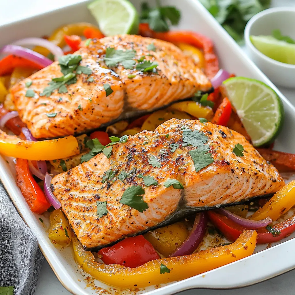 The olive oil helps the salmon and veggies roast nicely. Fajita seasoning gives that smoky, spicy taste. Lime juice adds a bright touch. Don’t forget to sprinkle cilantro on top before serving! It adds freshness and color to your plate.