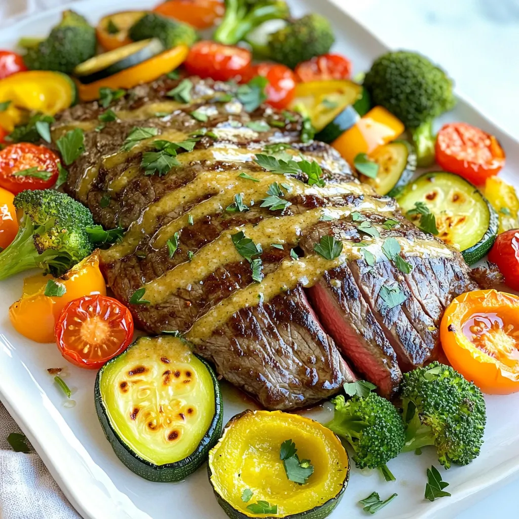 To serve, place the steak slices next to the roasted veggies. Drizzle any leftover garlic butter from the pan over everything. Finish with a sprinkle of fresh chopped parsley for color and extra flavor. Enjoy your meal!