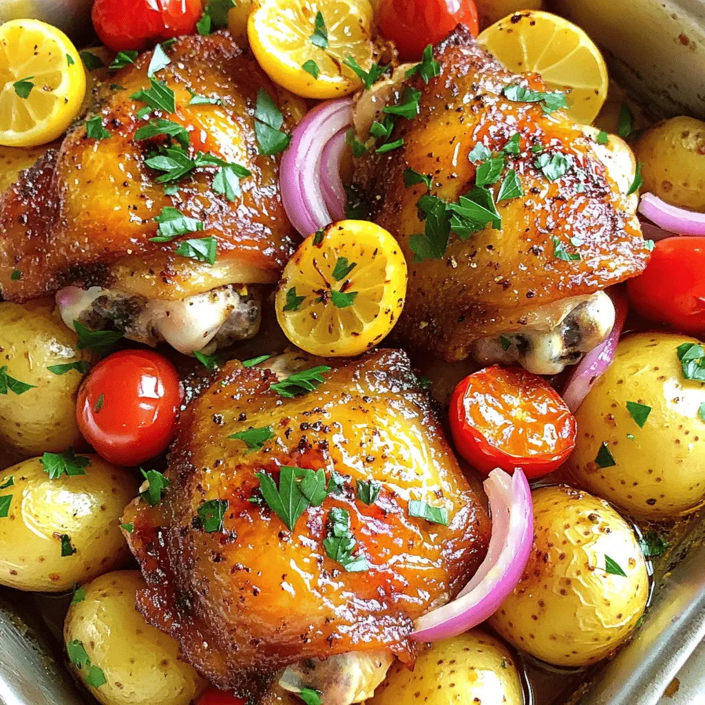 - 4 chicken thighs, skin-on and bone-in - 1 lb baby potatoes, halved - 1 red onion, cut into wedges - 1 cup cherry tomatoes, halved You start with chicken thighs, which give a juicy, rich flavor. The skin adds extra crispiness. Baby potatoes are perfect because they cook well and absorb flavors. Red onion adds sweetness and depth. Cherry tomatoes burst with juice, adding freshness. - 3 cloves garlic, minced - Juice of 1 lemon - 3 tablespoons olive oil - 1 teaspoon dried oregano - 1 teaspoon dried thyme - 1 teaspoon smoked paprika - Salt and pepper to taste The marinade is key to flavor. Garlic gives a strong, tasty kick. Lemon juice brightens every bite. Olive oil keeps everything moist. Dried oregano and thyme add that Mediterranean touch. Smoked paprika gives warmth and a hint of smoke. Don’t forget salt and pepper for balance. - Fresh parsley, chopped Fresh parsley makes a great garnish. It adds color and a fresh taste. Just chop it up and sprinkle it on right before serving. It looks pretty and tastes great too! 1. Preheating the oven: Start by preheating your oven to 425°F (220°C). This heat gets the chicken and potatoes nice and crispy. 2. Marinating the chicken and vegetables: In a large bowl, mix your chicken thighs, halved baby potatoes, red onion wedges, and cherry tomatoes. In a smaller bowl, whisk together minced garlic, lemon juice, olive oil, oregano, thyme, smoked paprika, salt, and pepper. Pour this marinade over your chicken and veggies. Make sure every piece gets coated well. This helps infuse great flavor. 3. Arranging on the sheet pan: Next, spread the marinated chicken and vegetables on a large baking sheet. Make sure they are in a single layer. This helps them cook evenly. 1. Roasting in the oven: Place the sheet pan in your preheated oven. Roast everything for about 30-35 minutes. Check that the chicken reaches an internal temperature of 165°F (75°C). The potatoes should be golden and tender. 2. Broiling for extra crispiness: If you like a crispy skin, turn on the broiler for an extra 2-3 minutes. Keep an eye on it so it doesn’t burn. This step gives you that perfect crunch. 3. Resting before serving: Once done, take the sheet pan out of the oven. Let the dish rest for a few minutes. This helps the juices settle in the chicken. 1. Garnishing with parsley: Before serving, sprinkle freshly chopped parsley over the chicken and potatoes. This adds a touch of color and fresh flavor. Enjoy your meal! - For the best taste, marinate the chicken for at least 30 minutes. - If you have time, let it sit overnight in the fridge. This helps the flavors soak in. - Use fresh herbs if you can. They add bright notes to the dish. - Don’t skip the lemon juice. It gives a zesty kick. - Always check the chicken’s internal temperature. It should be 165°F (75°C). - Ovens can vary, so keep an eye on cooking time. Start checking at 30 minutes. - If your oven runs hot, reduce the temperature slightly. - Serve the chicken and potatoes right from the pan for a rustic look. - Add a sprinkle of fresh parsley for color. It brightens up the dish nicely. - Pair with a simple salad or crusty bread. These sides balance the meal well. - For a complete feast, try serving with tzatziki sauce on the side. It adds creaminess. {{image_2}} Chicken alternatives If you want to switch up the protein, try using chicken breasts or even drumsticks. Boneless chicken cooks faster. For a lighter option, consider turkey thighs. They add a nice flavor that pairs well with potatoes. Vegetable options You can mix in or replace the veggies. Carrots, bell peppers, or zucchini are great choices. These add color and flavor while keeping the dish balanced. Feel free to use what you have on hand! Adding feta cheese Feta cheese can make this dish even more delightful. Sprinkle it on top during the last few minutes of baking. The warm feta melts and gives a creamy texture. It adds a nice tang that enhances the Greek flavors. Using different herbs If you want to try something new, switch up the herbs. Fresh basil, dill, or rosemary can work well. Each herb brings its own unique flavor. Mixing herbs can keep your meal exciting and fresh. Gluten-free version This recipe is gluten-free as is. Just ensure all your ingredients, like spices and oils, are gluten-free. This way, everyone can enjoy this tasty dinner without worries. Low-carb adaptations For a low-carb twist, skip the potatoes. Instead, add cauliflower florets or broccoli. These veggies provide a nice crunch and are low in carbs. This keeps the meal hearty but lighter. After enjoying your meal, let the leftovers cool. Place them in an airtight container. Store them in the fridge. They will stay good for about 3 to 4 days. This helps keep the chicken and potatoes fresh. To reheat, use your oven or a microwave. In the oven, preheat to 350°F (175°C). Place the dish in for around 15-20 minutes. This warms it evenly and keeps it crispy. If using a microwave, cover the dish. Heat for 2-3 minutes, checking often. This helps keep the chicken juicy and potatoes tender. Freezing is a great option too. Portion the leftovers into smaller containers. Make sure to label them with the date. You can freeze them for up to 3 months. When ready to eat, thaw in the fridge overnight. Reheat as mentioned above for the best taste and texture. You should marinate the chicken for at least 30 minutes. This time lets the flavors soak in. If you have more time, marinate it for up to 2 hours. The longer it sits, the better the taste. Just keep it in the fridge while it marinates. Yes, you can use boneless chicken. Just remember, boneless chicken cooks faster. Cut the cooking time by about 10 minutes. Check the internal temperature to ensure it reaches 165°F (75°C). The texture may be a bit different, but it will still be tasty. You can serve many things with this dish. A fresh Greek salad pairs well with it. You might also enjoy some warm pita bread. Roasted vegetables or a side of 
