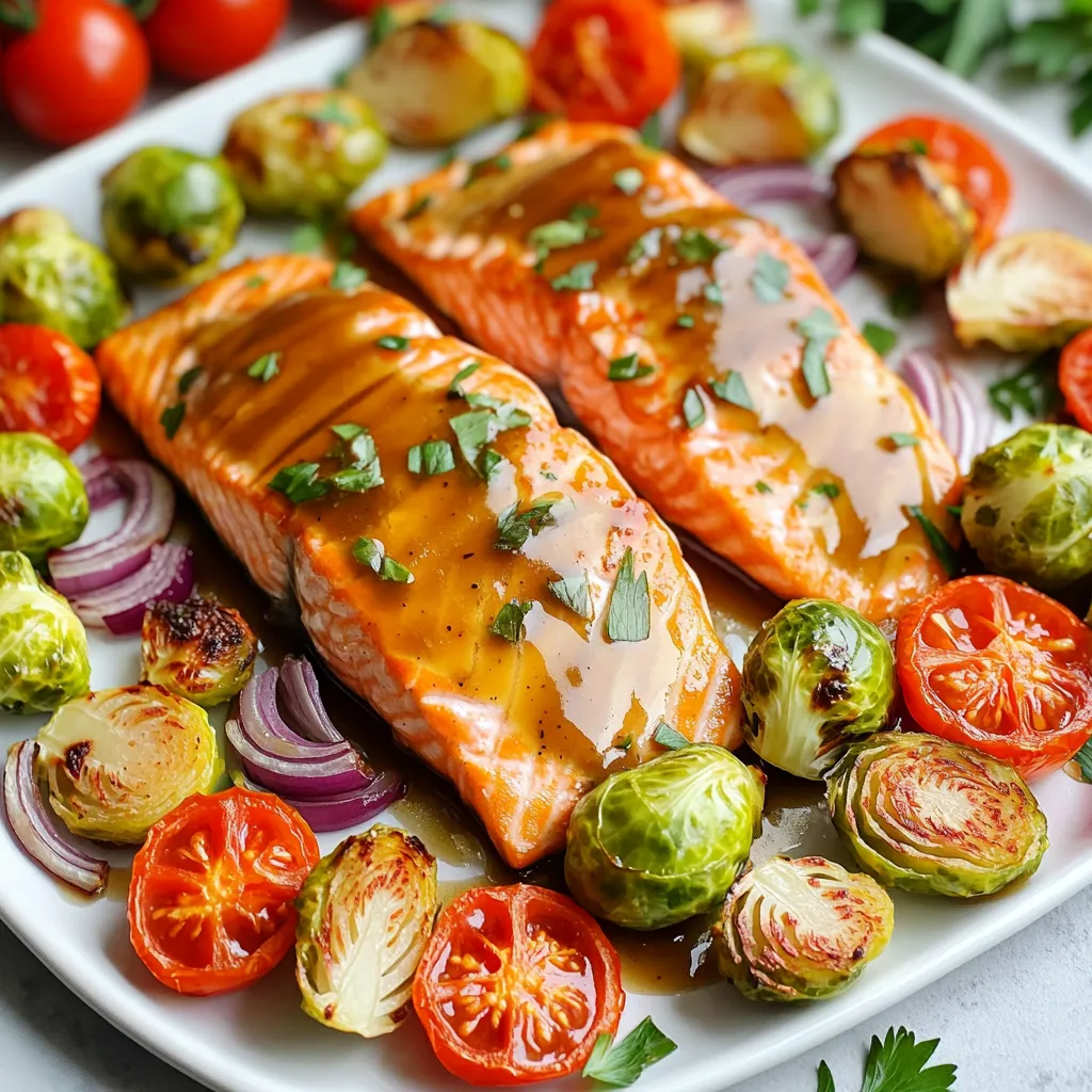 You need fresh salmon for this dish. I recommend using: - 4 salmon fillets (6 oz each) - 2 tablespoons Dijon mustard - 3 tablespoons pure maple syrup - 2 tablespoons olive oil These main ingredients create a tasty base. The salmon offers healthy fats. The maple syrup adds sweetness, while the Dijon gives a nice tang. For great color and flavor, include these veggies: - 2 cups Brussels sprouts, halved - 1 bell pepper, sliced (any color) - 1 medium red onion, cut into wedges - 1 cup cherry tomatoes These vegetables provide crunch and a pop of color. Brussels sprouts are rich in vitamins. Bell peppers add sweetness, and tomatoes bring juiciness. To boost the taste, you’ll need: - 1 teaspoon garlic powder - 1 teaspoon onion powder - 1 teaspoon smoked paprika - Salt and pepper to taste These seasonings add depth to the dish. Garlic powder and onion powder enhance the savory notes. Smoked paprika gives a subtle smoky flavor, making each bite exciting. First, set your oven to 400°F (200°C). This heat helps the salmon and veggies cook well together. Next, line a sheet pan with parchment paper. This makes cleanup easy and keeps food from sticking. In a small bowl, combine the following ingredients: - 2 tablespoons Dijon mustard - 3 tablespoons pure maple syrup - 2 tablespoons olive oil - 1 teaspoon garlic powder - 1 teaspoon onion powder - 1 teaspoon smoked paprika - Salt and pepper to taste Whisk these together until they blend nicely. This mixture adds a sweet, tangy flavor to your salmon and veggies. On one side of the sheet pan, place the four salmon fillets. Brush half of the maple Dijon mixture over them. This coats the salmon and adds flavor. On the other side, spread out the halved Brussels sprouts, sliced bell pepper, and onion wedges. Drizzle the rest of the maple Dijon mixture on top. Toss the veggies well to ensure they are coated evenly. Now, scatter the cherry tomatoes around the veggies. They add color and sweetness to the dish. Place the sheet pan in the oven and roast for 15-20 minutes. The salmon is done when it flakes easily with a fork. The veggies should be tender and slightly caramelized. After roasting, take the pan out and let it rest for 5 minutes. This helps the flavors settle. Enjoy your delicious meal! To get the best salmon, start with fresh fillets. Look for bright, shiny skin. The flesh should feel firm to the touch. Before cooking, let the salmon sit at room temperature for 15 minutes. This helps it cook evenly. When you brush on the maple Dijon mixture, don’t hold back! Coat it well for great flavor. Bake until it flakes easily with a fork, about 15-20 minutes. This means it is cooked just right. Prep your veggies right before cooking. Cut Brussels sprouts in half for even cooking. Slice the bell pepper into nice thin strips. This helps them roast well. The red onion should be in wedges for a sweet taste. Toss all veggies in the remaining maple Dijon mix. This adds great flavor and helps them caramelize. Spread them out on the pan. Crowding them can lead to steaming instead of roasting. Cleaning up after cooking can be a breeze. Use parchment paper to line your sheet pan. It makes for easy cleanup. Once you finish cooking, let the pan cool before washing. Soak any stuck-on bits in warm, soapy water for a few minutes. For stubborn stains, a gentle scrub with a sponge works well. Keeping your cookware in good shape means it lasts longer. Plus, it makes your next meal prep easier! {{image_2}} You can switch up the veggies you use. Try using asparagus for a fresh crunch. Zucchini slices also work well. Carrots add a sweet flavor and vibrant color. Get creative with seasonal veggies like cauliflower or green beans. Just keep the cooking time in mind, as some veggies cook faster than others. The maple Dijon marinade is great, but you can explore other flavors. Try using soy sauce for a salty kick. Honey can replace maple syrup if you like it sweeter. For a tangy twist, add lemon juice or balsamic vinegar. You can mix in fresh herbs like dill or thyme for added taste. If you love some spice, there are easy ways to add heat. Mix in red pepper flakes for a mild kick. You can also add sriracha or your favorite hot sauce to the marinade. Another option is to use a spicy mustard instead of Dijon. This gives a nice zing to the salmon and veggies. To keep your leftovers fresh, place them in an airtight container. This helps lock in moisture and flavor. Store the salmon and veggies together or separate them based on your preference. If stored correctly, they will last in the fridge for up to three days. Make sure to let the food cool to room temperature before sealing it. When you are ready to enjoy your leftovers, reheating is simple. Preheat your oven to 350°F (175°C). Place the salmon and veggies on a baking sheet. Cover them with foil to keep them moist. Heat for about 10-15 minutes or until warmed through. You can also use a microwave, but be careful not to overcook the salmon. Heat in short intervals, checking often. If you want to freeze this meal, it is best to freeze the uncooked ingredients. Prepare the salmon and veggies, then place them in a freezer-safe bag or container. Remove as much air as possible. This method will keep your meal fresh for up to three months. If you freeze cooked salmon and veggies, they can last about two months. Just remember to thaw them in the fridge overnight before reheating. It takes about 15 to 20 minutes to cook salmon on a sheet pan. The key is to preheat your oven to 400°F (200°C). Check the salmon at 15 minutes. It should flake easily with a fork when done. If it needs more time, keep checking every few minutes. Yes, you can use frozen salmon for this recipe. Just make sure to thaw it first. Thaw it in the fridge overnight or use the quick method. Place it in a sealed bag and run it under cold water for about 30 minutes. After thawing, pat it dry and follow the same steps for seasoning. You can get creative with seasonings!