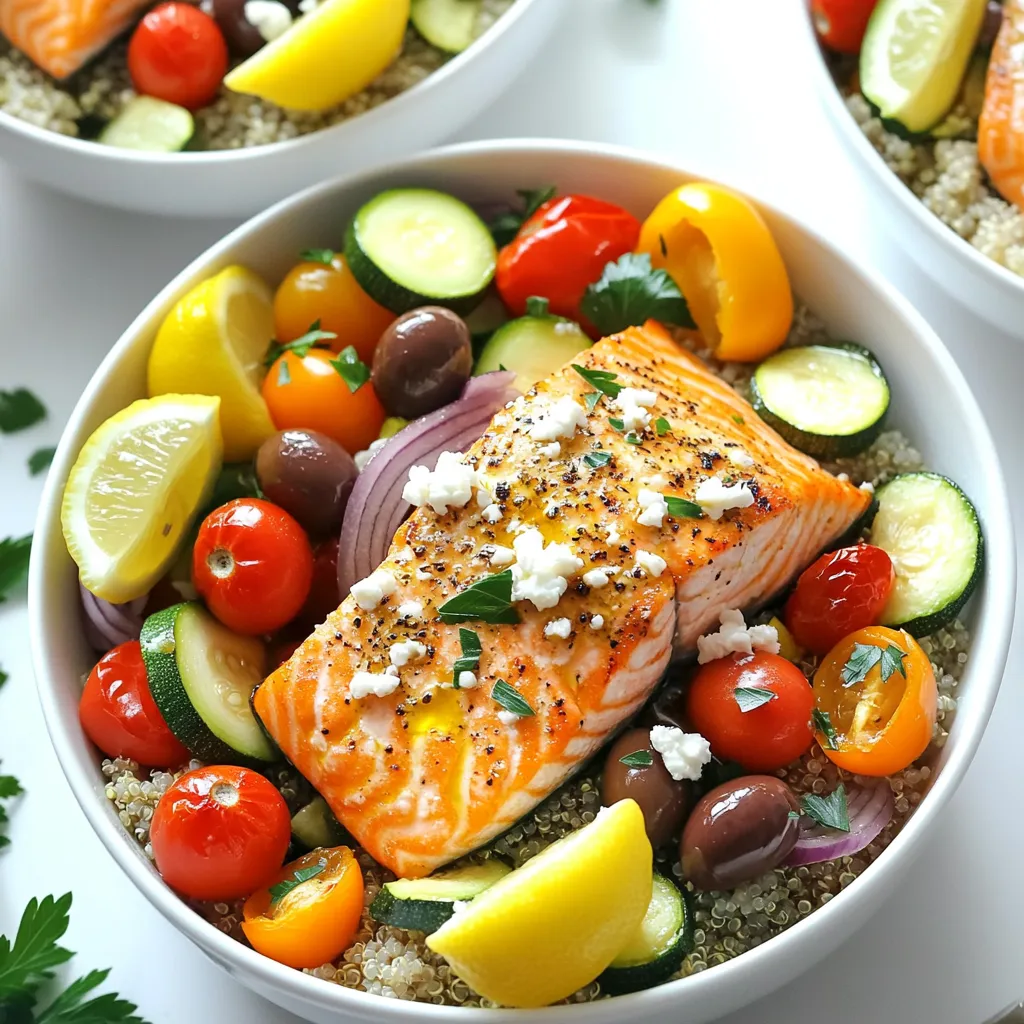 For presentation, use large, shallow bowls. Start with quinoa, then layer salmon and veggies on top. Sprinkle with feta and olives for color. A lemon wedge on the side adds a nice touch. Garnish with fresh parsley for a pop of green.