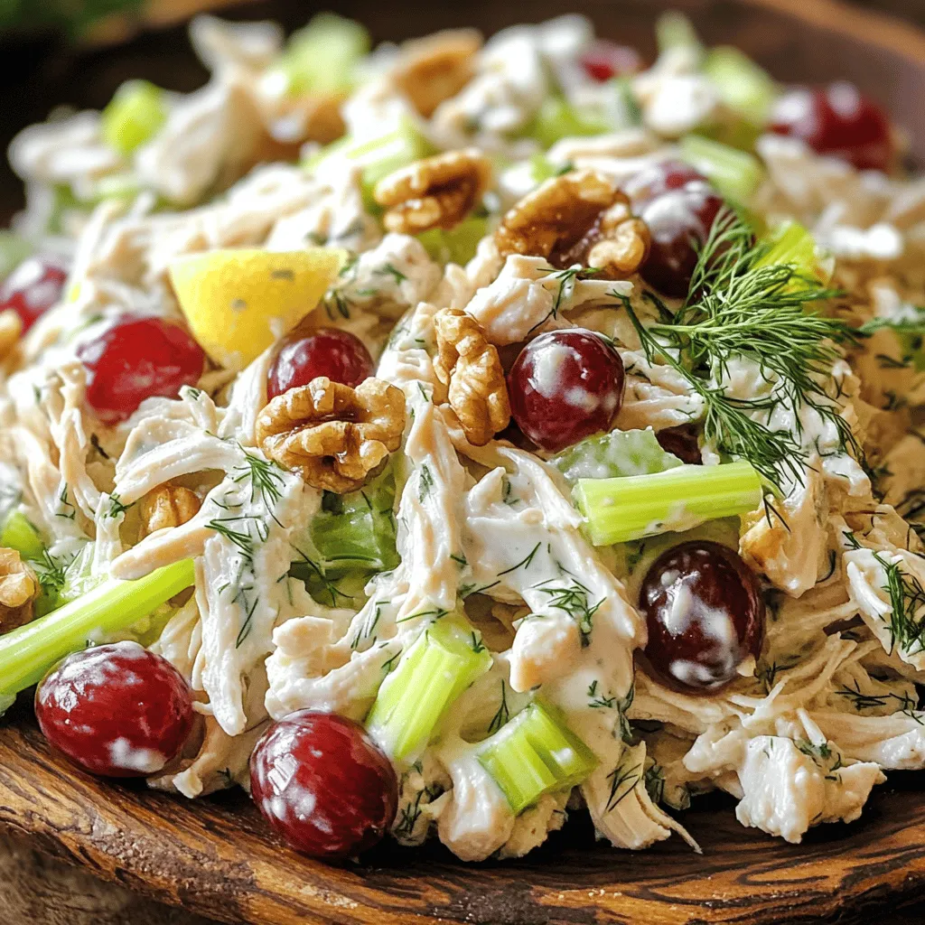 To make Simple Greek Yogurt Chicken Salad, you need these key ingredients: - 2 cups cooked chicken, shredded or diced - 1 cup plain Greek yogurt - 1/4 cup celery, finely chopped - 1/4 cup red grapes, halved - 1/4 cup walnuts, chopped - 1 tablespoon Dijon mustard - 1 tablespoon honey - 1 tablespoon fresh dill, chopped - Salt and pepper to taste - 1 tablespoon lemon juice These ingredients create a fresh, creamy salad that bursts with flavor. You can add these for extra flavor or texture: - Sliced almonds for crunch - Diced apples for sweetness - Chopped green onions for a bite - A sprinkle of paprika for color These options let you customize the salad to your taste. Each serving of this salad has about: - Calories: 300 - Protein: 30g - Fat: 15g - Carbohydrates: 20g Using Greek yogurt adds health benefits as it is high in protein and low in fat. It also contains probiotics, which help with gut health. This makes the salad a nutritious choice for lunch or dinner. You can find the Full Recipe at the top. To start, gather all your ingredients. You need 2 cups of cooked chicken. You can use leftover chicken or cook it fresh. If you use fresh chicken, boil or grill it first. Once the chicken is ready, shred or dice it into small pieces. Shredding works best for a soft texture. Use two forks to pull the chicken apart. For dicing, simply cut it into small cubes. Next, chop the celery finely. You want small bits for a nice crunch. Halve the red grapes and chop the walnuts too. This adds sweetness and crunch to your salad. Now, take a large mixing bowl. Add the shredded chicken and Greek yogurt. Stir well until the chicken is coated. Then, add the chopped celery, grapes, and walnuts. Mix them in gently. In a small bowl, whisk together the Dijon mustard, honey, fresh dill, lemon juice, salt, and pepper. This dressing brings all the flavors together. Pour it over the chicken mixture. Stir until everything is well combined. Taste your salad. If it needs more flavor, add a touch of salt and pepper. Cover the bowl and put it in the fridge for at least 30 minutes. This helps the flavors blend. Serve the salad chilled. You can enjoy it on its own, in a sandwich, or atop a bed of greens. The creamy texture and fresh taste make it a perfect dish for any meal. For the complete recipe, check out the Full Recipe. When making Greek yogurt chicken salad, avoid a few common mistakes. First, don't skip the cooling step. Let the salad chill for at least 30 minutes. This helps the flavors blend well. Second, be careful not to overmix. You want to keep some texture in the chicken. To enhance flavor, try adding fresh herbs. Chopped parsley or cilantro brightens the dish. You can also squeeze in extra lemon juice for a zesty kick. For texture, consider adding diced apples or chopped bell peppers. They add crunch and sweetness. Using pre-cooked or store-bought chicken can save you time. Look for rotisserie chicken at the store. It’s tasty and cuts down on prep time. You can also buy pre-chopped veggies. This makes your task even easier. For meal prep, consider making a big batch. Store it in airtight containers. This way, you have a quick lunch ready to go. You can also portion the salad into jars. This makes it easy to grab on busy days. Enjoy your Simple Greek Yogurt Chicken Salad anytime with these tips! {{image_2}} You can add fun flavors to your chicken salad. Try mixing in fruits or nuts. For a sweet twist, add diced apples or berries. They bring a nice crunch and sweetness. Chopped pistachios or almonds can also add texture. Herbs and spices make a big difference too. Fresh basil or parsley can brighten the dish. If you like heat, add a pinch of cayenne pepper or some chili flakes. You can even try a dash of curry powder for a unique flavor. Want a gluten-free option? Simply use gluten-free chicken or check your nut ingredients. For a vegan take, swap the chicken for chickpeas or tofu. Use plant-based yogurt instead of Greek yogurt. If you are keeping it low-carb, skip the grapes and nuts. You can add more veggies. Try bell peppers or cucumbers for crunch. You’ll still enjoy a tasty and filling meal without the carbs. For the full recipe, check the earlier section and enjoy your cooking! To keep your Simple Greek Yogurt Chicken Salad fresh, store it in an airtight container. This helps prevent it from drying out or absorbing other fridge smells. If you can, use glass containers. They are great for keeping food fresh and can help with reheating. Your chicken salad will stay good in the fridge for about 3 to 4 days. You can enjoy your chicken salad cold straight from the fridge. If you prefer it warm, heat it gently in a microwave. Use a low power setting and stir often to heat it evenly. Always check the temperature to ensure it is safe to eat. Be careful not to overheat, as it can change the texture of the yogurt. Remember, leftovers should be eaten within the recommended 3 to 4 days for safety. How to make the chicken salad creamy without mayonnaise? You can use Greek yogurt for creaminess. It gives a rich texture and flavor. Greek yogurt has a thick consistency, perfect for chicken salad. Mix it well with your chicken and other ingredients. The yogurt adds a tangy taste. It’s a healthier choice than mayonnaise. Can I freeze Greek yogurt chicken salad? Freezing Greek yogurt chicken salad is not recommended. The yogurt changes texture when thawed. It can become watery and grainy. It’s best to enjoy this dish fresh. If you have leftovers, store them in the fridge. How long can you keep Greek yogurt chicken salad in the fridge? You can keep Greek yogurt chicken salad in the fridge for about three days. Make sure to store it in an airtight container. This keeps it fresh and safe to eat. After three days, the flavors may fade. What to serve with chicken salad? You can serve Greek yogurt chicken salad in many ways. It’s great on a bed of greens. You can also use it as a filling for sandwiches or wraps. Pair 