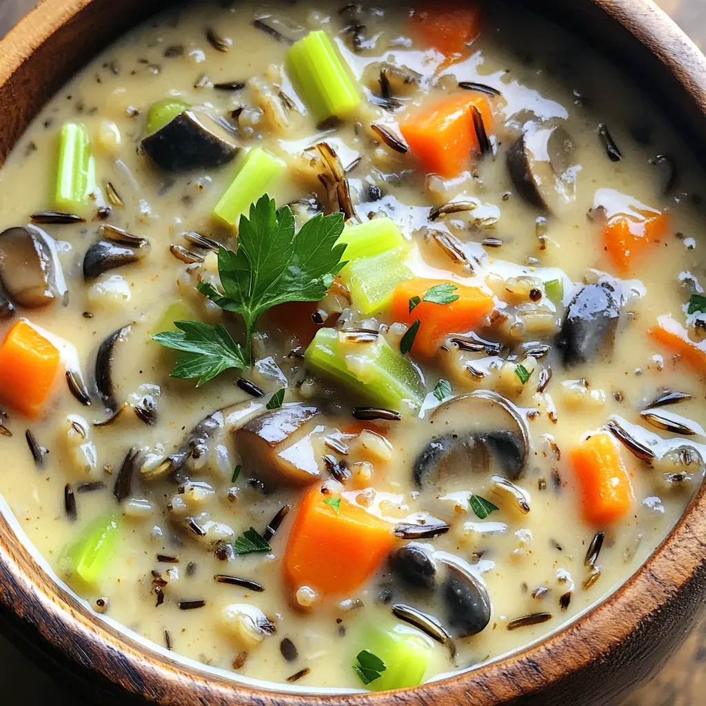 This soup pairs well with crusty bread. A fresh salad on the side adds crunch. Try serving it in a bread bowl for a fun twist. A sprinkle of lemon juice brightens the dish. For a hearty meal, add a protein like grilled chicken or tofu on the side. Enjoy the warmth and comfort of this creamy mushroom wild rice soup!