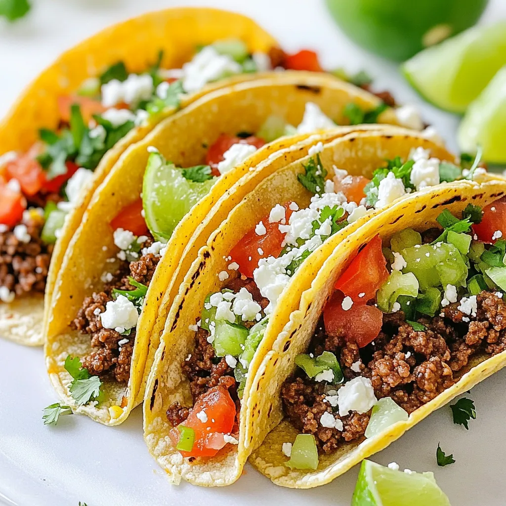 - 1 lb ground beef - 2 tablespoons chipotle peppers in adobo sauce, finely chopped - 1 medium onion, diced - 3 cloves garlic, minced - 1 teaspoon ground cumin - 1 teaspoon smoked paprika - ½ teaspoon cayenne pepper (adjust for spice preference) For these tacos, the main ingredients create a bold flavor. Ground beef is the heart of the dish. It cooks quickly and absorbs spices well. The chipotle peppers in adobo sauce add heat and smokiness. This makes your tacos exciting. Diced onion and minced garlic add depth. The spices, like cumin and smoked paprika, round out the flavor profile. If you like it spicy, adjust the cayenne pepper to your taste. - 8 small corn tortillas - 1 cup shredded lettuce - 1 cup diced tomatoes - ½ cup crumbled feta or cotija cheese - Fresh cilantro, for garnish - Lime wedges, for serving Toppings make your tacos fresh and fun. Corn tortillas are perfect for holding all the goodness. Shredded lettuce adds crunch, while diced tomatoes bring in sweetness. Crumbled feta or cotija cheese gives a salty kick. Fresh cilantro adds a burst of flavor. Finally, lime wedges are essential. A squeeze of lime brightens every bite. - 1 tablespoon olive oil - Salt and pepper to taste Cooking essentials help tie everything together. Olive oil is your go-to fat for sautéing. It keeps your ingredients from sticking and adds flavor. Salt and pepper are must-haves. They enhance and balance the dish. Use them freely to make sure every bite is tasty. {{ingredient_image_1}} - Dicing onions and mincing garlic: Start by peeling the onion. Cut it in half, then chop each half into small pieces. For garlic, peel the cloves and mince them finely. This mix adds a great base flavor. - Chopping chipotle peppers: Take your chipotle peppers from the adobo sauce. Use a sharp knife to chop them finely. The more you chop, the more flavor you release. Measure two tablespoons for the beef. - Sautéing onions and garlic: Heat olive oil in a large skillet over medium heat. Add the diced onions and minced garlic. Stir them often and cook until the onions turn clear, about three to four minutes. This step builds the flavor. - Browning ground beef with spices: Increase the heat to medium-high. Add one pound of ground beef to the skillet. Use a wooden spoon to break it apart. Cook for five to seven minutes until the beef is brown. Then stir in your chopped chipotle peppers, cumin, smoked paprika, cayenne pepper, salt, and pepper. Mix well and let it cook for another three to four minutes. The spices will create a rich and spicy mix. - Warming corn tortillas: In a separate skillet, warm eight small corn tortillas over low heat. Flip them occasionally until they are soft and warm. This makes them easier to fold. - Layering the beef and toppings: Take a warm tortilla and place a generous scoop of your chipotle beef in the center. Top it with shredded lettuce, diced tomatoes, and crumbled feta or cotija cheese. Garnish with fresh cilantro and serve with lime wedges on the side. Enjoy the burst of flavors in every bite! To make your spicy chipotle beef just right, adjust the cayenne pepper. If you love heat, add more. If you prefer it milder, use less. This simple change can fit your taste perfectly. Always taste as you cook, so you can balance the flavors. For flavor extraction, use a technique called sautéing. First, cook onions and garlic in olive oil. This brings out their natural sweetness. When the beef cooks, let it brown well. This step adds a rich flavor to your tacos. Don't rush it! Warming tortillas is key for soft, tasty tacos. Use a skillet over low heat. Flip them often until they are warm and soft. You can also wrap them in foil and place them in the oven. This keeps them warm for serving. Corn tortillas are traditional and bring a great flavor. They are also gluten-free. Flour tortillas are softer and can hold more filling. Choose based on your preference for texture and taste. To enhance your tacos, add fresh toppings. Shredded lettuce adds crunch. Diced tomatoes bring freshness. Feta or cotija cheese offers a salty bite. Fresh cilantro gives a bright burst of flavor. Pair your tacos with a refreshing drink. A cold beer works well. For something non-alcoholic, try a limeade. These drinks balance the spice and make the meal complete. Pro Tips Choose the right beef: For the best flavor and texture, use ground beef with a higher fat content, such as 80/20, which will keep the tacos juicy and flavorful. Customize your heat: Adjust the amount of cayenne pepper and chipotle peppers based on your spice tolerance. Start with less and add more to taste if you prefer a spicier kick. Warm the tortillas properly: For the best texture, warm the corn tortillas on a skillet until they are soft and pliable. This prevents them from cracking when you fold them. Garnish wisely: Fresh cilantro and lime juice are essential for balancing the flavors. Don't skip these toppings as they add brightness and freshness to the dish. {{image_2}} You can swap the ground beef for other proteins. Ground turkey is a great choice. It’s lean and still full of flavor. Ground chicken works well too. For a vegetarian option, try black beans or lentils. Both options pack a protein punch and taste great with spices. To make your tacos even better, add beans. Black beans or pinto beans fit perfectly. You can also mix in more spices. Try adding chili powder or oregano for extra depth. Changing the cheese can also enhance the taste. Crumbled queso fresco or sharp cheddar can bring a new twist to your meal. Think beyond traditional tacos. Taco bowls are fun and filling. Use a bowl of rice or quinoa as a base. Lettuce wraps are a fresh, low-carb option. Simply use large lettuce leaves instead of tortillas. You can even bake your tacos in the oven. Place filled tortillas in a baking dish and top with cheese. Bake until golden and bubbly for a crunchy delight. To store leftovers, wait for the tacos to cool. Place them in an airtight containe