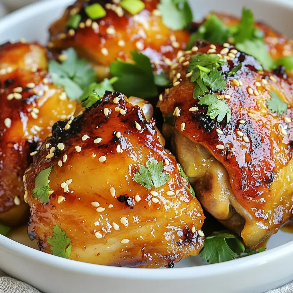To make Spicy Honey Garlic Chicken Thighs, you will need: - 4 chicken thighs, skin-on and bone-in - 1 tablespoon olive oil - 4 cloves garlic, minced - 1/4 cup honey - 2 tablespoons soy sauce - 1 tablespoon sriracha (adjust to taste) - 1 teaspoon grated ginger - 1 teaspoon salt - 1/2 teaspoon black pepper - 1 tablespoon sesame seeds (for garnish) - Fresh cilantro or green onions (for garnish) You can add a few optional items to boost the flavor: - Lime juice for a tangy kick - Red pepper flakes for extra heat - Green onions for freshness - Rice vinegar for a bit of acidity If you don't have some ingredients, here are some swaps: - Use agave syrup instead of honey for a vegan option. - Tamari can replace soy sauce for a gluten-free choice. - For a milder heat, skip the sriracha or use less. - Garlic powder can substitute fresh garlic if needed. These ingredients create a perfect balance of sweet, spicy, and savory flavors. Enjoy the process of cooking and make it your own! {{ingredient_image_1}} To make the marinade, grab a bowl. Add minced garlic, honey, soy sauce, sriracha, grated ginger, salt, and black pepper. Whisk all the ingredients together until they mix well. This mix gives the chicken a sweet and spicy flavor. The garlic and ginger add depth. Now, take your chicken thighs. Place them in a resealable bag or a shallow dish. Pour the marinade over the chicken. Make sure each piece is well coated. Seal the bag or cover the dish. Let it marinate in the fridge for at least 30 minutes. For even better flavor, let it sit for up to 4 hours. This helps the flavors soak in. Preheat your oven to 400°F (200°C). While the oven heats up, take an oven-safe skillet. Heat olive oil over medium-high heat. Remove the chicken from the marinade but keep the marinade. Put the chicken skin-side down in the skillet. Sear for about 4-5 minutes until the skin gets crispy and brown. Once the skin is perfect, flip the chicken over. Pour the reserved marinade on top. Now, transfer the skillet to your preheated oven. Bake for 25-30 minutes. You want the chicken to reach an internal temperature of 165°F (74°C). When it is done, take it out and let it rest for 5 minutes. Garnish with sesame seeds and chopped cilantro or green onions for a fresh touch. To get that perfect crispy skin, start by patting the chicken thighs dry. This step helps the skin crisp up nicely. When you sear the chicken, make sure to use medium-high heat. Do not move the chicken around too much. Let it sit in the pan for about 4-5 minutes. This helps form a golden crust. After searing, flip the chicken and pour on the reserved marinade. This keeps the skin moist while baking. Marinating is key for flavor. Try to marinate your chicken for at least 30 minutes. If you have time, marinate it for up to 4 hours. This longer time lets the flavors soak in deeper. Use a resealable bag or a shallow dish to coat the chicken well. Be sure to turn the chicken occasionally to ensure even flavor. Always save some marinade for later; it adds great taste when baking. After cooking, let the chicken rest for about 5 minutes. This helps the juices settle, making it tender. For garnish, sprinkle sesame seeds and chopped cilantro or green onions. Serve your chicken with rice or a fresh salad. These sides balance the spicy flavors nicely. You can also pair it with steamed veggies or a light coleslaw for extra crunch. Enjoy this dish with family and friends for a delightful meal. Pro Tips Use Fresh Ingredients: Fresh garlic and ginger will enhance the flavor of the marinade significantly compared to pre-minced or powdered versions. Let it Rest: Allowing the chicken to rest for a few minutes after baking helps the juices redistribute, making for a juicier bite. Adjust the Heat: If you prefer a milder dish, reduce the sriracha or omit it altogether; you can always add it to your serving for those who enjoy extra spice. Perfect Searing: Make sure your skillet is hot enough before adding the chicken to achieve that crispy skin—don’t rush this step! {{image_2}} You can switch up the protein in this dish for fun. Try using chicken breasts instead of thighs. They will cook faster, so keep an eye on them. You can also use pork chops. The marinade works well with pork too. If you want something lighter, consider shrimp. Shrimp cooks quickly and absorbs the flavors well. If you want a meat-free meal, use tofu or tempeh. Press the tofu to remove extra water, then cube it. Marinate it like you would chicken. Bake until golden. Another option is to use portobello mushrooms. Their meaty texture holds up well to the marinade. Just grill or bake them for a tasty dish. You can change the flavor profile with simple swaps. For a fruity twist, add orange juice or zest to the marinade. This adds a fresh note that balances the spice. If you love heat, try adding more sriracha or some red pepper flakes. For a smoky flavor, a dash of smoked paprika does wonders. Don’t be afraid to experiment and make it your own! You can store leftover Spicy Honey Garlic Chicken Thighs in an airtight container. Let the chicken cool for a bit. Place it in the fridge within two hours of cooking. Proper storage keeps the chicken fresh for up to three days. To reheat, preheat your oven to 350°F (175°C). Place the chicken on a baking sheet. Cover it with foil to keep moisture in. Heat for about 15-20 minutes until warm. If you prefer, you can also use a microwave. Just heat for 1-2 minutes, checking often. You can freeze this chicken if you have extra. Wrap each piece tightly in plastic wrap. Then, place them in a freezer bag. Be sure to remove as much air as possible. Frozen chicken can last for up to three months. To enjoy later, thaw it in the fridge overnight before reheating. You can use maple syrup or agave nectar for a sweet taste. Both options work well in this recipe. Each has a unique flavor, but they keep the dish sweet. If you want a lower-calorie choice, consider using a sugar substit