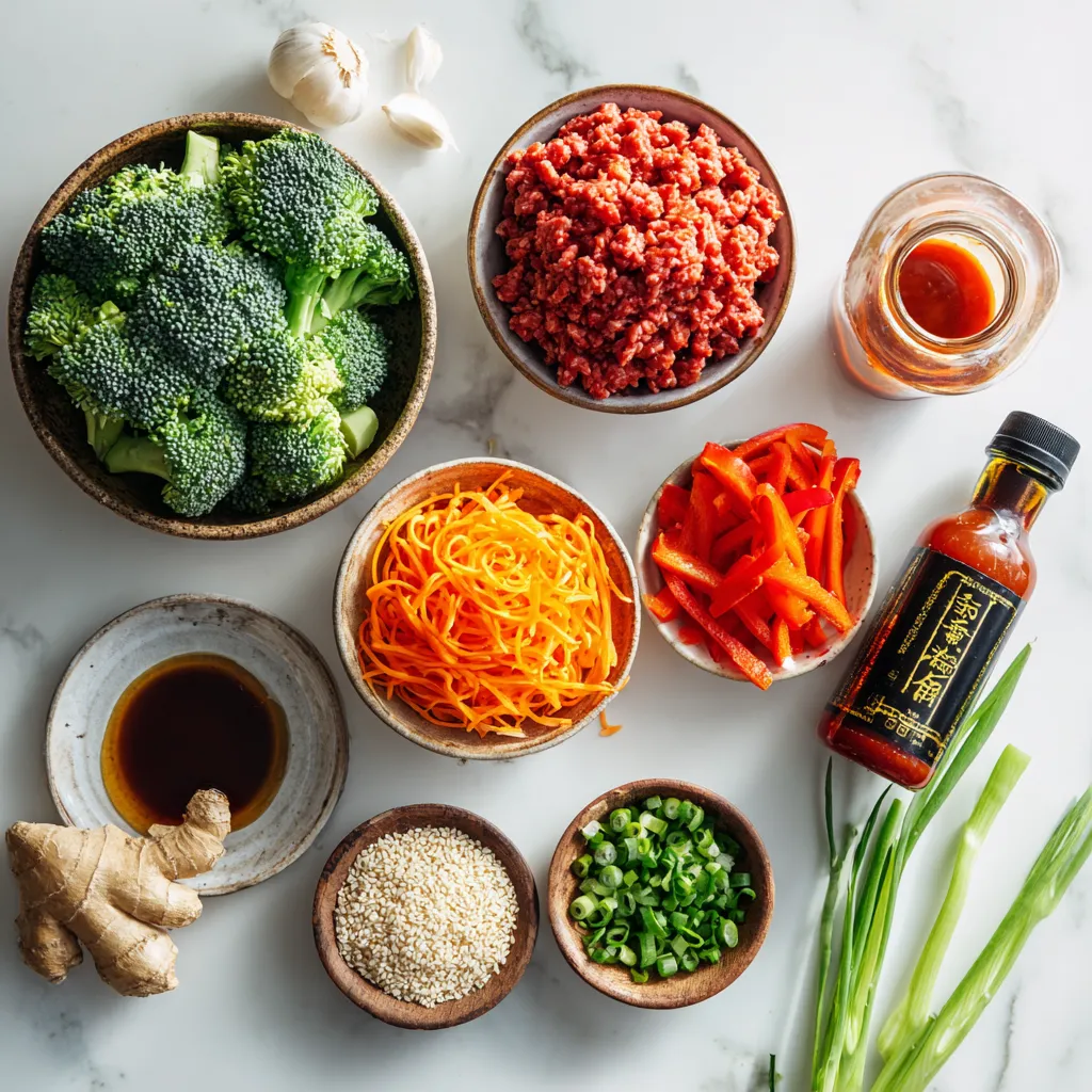 Ground turkey is a lean protein that cooks quickly. It takes on flavors well. Broccoli adds crunch and nutrients. Red bell pepper brings sweetness. Carrots add color and texture. Together, these ingredients create a tasty base for the stir-fry.