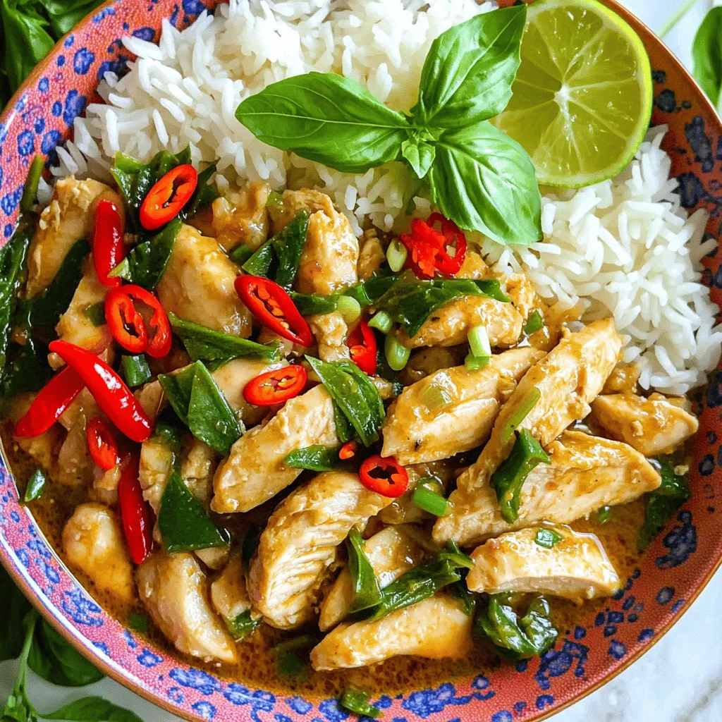 To make Spicy Thai Basil Chicken, gather these key ingredients: - 1 lb chicken breast, thinly sliced - 2 tablespoons vegetable oil - 4 cloves garlic, minced - 2-3 Thai bird's eye chilies, sliced (adjust for spice level) - 1 red bell pepper, sliced - 1 cup Thai basil leaves (fresh) - 2 tablespoons soy sauce - 1 tablespoon oyster sauce (optional) - 1 tablespoon fish sauce - 1 teaspoon sugar - 1 teaspoon ground white pepper - Cooked jasmine rice for serving These ingredients create a vibrant and tasty dish. The chicken breast provides protein, while Thai bird's eye chilies give it a spicy kick. Garlic adds depth, and the red bell pepper brings a sweet crunch. Fresh Thai basil leaves add an aromatic flavor that makes this meal truly special. Soy sauce, oyster sauce, and fish sauce create a rich umami base. Sugar softens the heat, and ground white pepper adds a subtle warmth to the mix. Serving it over jasmine rice makes a perfect meal. Feel free to adjust the spice by adding more or fewer chilies. Each ingredient plays a vital role in this quick dinner. Enjoy the process of cooking and savor the flavors! Start by slicing the chicken breast. Cut it into thin pieces, about 1/4 inch thick. Thin slices cook quickly and evenly. This makes sure your chicken is tender and juicy. 1. Heat the Oil: In a large skillet or wok, pour in the vegetable oil. Turn the heat to medium-high and let it get hot but not smoking. 2. Cook Garlic and Chilies: Add minced garlic and sliced chilies. Sauté them for about 30 seconds. You want to smell the garlic and see it turn golden. 3. Add Chicken: Now, increase the heat to high. Toss in the sliced chicken and stir-fry for 3-4 minutes. Cook until the chicken turns white and is no longer pink. 4. Incorporate Vegetables: Add the sliced red bell pepper. Stir-fry for another 1-2 minutes. This keeps the peppers a bit crisp. 1. Sauce It Up: Pour in soy sauce, fish sauce, and sugar. Add ground white pepper too. Stir everything well to coat the chicken and veggies. Let it cook for another 1-2 minutes. 2. Add Basil: Remove the skillet from the heat. Fold in fresh Thai basil leaves. Stir just until the basil wilts. 3. Serve: Plate the spicy Thai basil chicken over cooked jasmine rice. You can garnish with extra basil or chili slices if you like. Enjoy your meal! To get the right spice level, start with 2-3 Thai bird's eye chilies. If you want more heat, add extra chilies. For a milder taste, use fewer chilies. Balancing flavors is key. Combine soy sauce, oyster sauce, and fish sauce. Each sauce adds depth and richness. A touch of sugar helps balance the heat. Taste as you go to find your perfect mix. Stir-frying is all about high heat and quick cooking. Use a large skillet or wok for best results. Heat the oil until hot but not smoking. This helps the garlic and chilies release their flavor. When adding chicken, make sure it's in a single layer. This ensures even cooking. Keep your veggies crisp by adding them later in the cooking process. Stir-fry them until they are just tender, but still have a crunch. For a beautiful presentation, serve the dish in a bowl. Top it with a sprig of fresh basil. You can add lime wedges on the side. Lime adds a bright and fresh flavor. This dish pairs well with cooked jasmine rice, which soaks up the sauce nicely. Enjoy your meal! {{image_2}} You can switch the chicken for beef, pork, or tofu. Each option brings a new taste. Thinly slice beef or pork, just like the chicken. For tofu, use firm or extra-firm. Press it to remove water, then cut it into cubes. This way, the protein soaks up all the delicious sauces. To make a plant-based version, use mushrooms and tofu. Mushrooms add a nice umami flavor. Sauté them until soft before adding tofu. This combo keeps the dish satisfying and full of taste. Toss in some fresh veggies like bell peppers for extra color and crunch. Not everyone enjoys spicy food, and that's okay! To make it milder, use fewer Thai bird's eye chilies. You can also remove the seeds to lower the heat. Adding more sugar can balance the spice too. Taste as you go to find the right level for you and your guests. To keep your Spicy Thai Basil Chicken fresh, follow these steps: - Cool the dish to room temperature. - Place it in an airtight container. - Store it in the fridge for up to three days. - If you want to keep it longer, freeze it for up to three months. When freezing, use freezer-safe bags to prevent freezer burn. To reheat your meal, do this: - For the microwave, place the chicken in a bowl. - Add a splash of water to keep it moist. - Heat on medium for two to three minutes, stirring halfway. For the stove, heat a pan over medium-low. Add the chicken and a little water, stirring until hot. For safe consumption: - Refrigerated leftovers last up to three days. - Frozen leftovers can be eaten within three months. Always check for signs of spoilage before eating. If it smells off or looks strange, throw it out. If you cannot find Thai basil, you can try regular basil. It has a sweet taste but lacks the distinct flavor of Thai basil. You can also use mint for a fresh touch. Another option is holy basil, which has a peppery taste. Each substitute will change the dish's flavor, so choose based on your taste. Yes, you can prepare this dish ahead. Cook the chicken and store it in the fridge. Keep the sauce separate to prevent sogginess. You can also chop the veggies ahead of time. When ready to eat, just heat everything together. This saves time and makes dinner quick! This dish can be gluten-free with some changes. Use gluten-free soy sauce instead of regular soy sauce. Check the fish sauce as some brands may contain gluten. Avoid oyster sauce if it is not gluten-free. With these swaps, you can enjoy this tasty meal without worry. This guide shows you how to make Spicy Thai Basil Chicken. It covers key ingredients, step-by-step cooking, and helpful tips. Now you can adjust the spice level or swap proteins with ease. Remember, storin