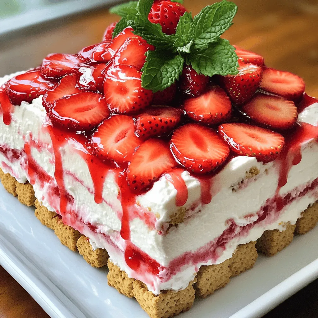 To make a delicious Strawberry Cheesecake Icebox Cake, gather these ingredients. Fresh strawberries give a burst of flavor. Cream cheese adds richness. Powdered sugar sweetens the mix. Vanilla extract brings a warm note. Heavy whipping cream makes it light and airy. Graham crackers form the base layers. Strawberry jam adds sweetness on top. If you like, use mint leaves for a pretty garnish.