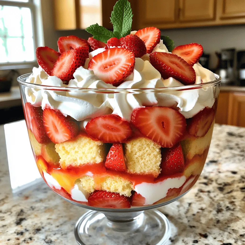 ![To make a tasty Strawberry Shortcake Trifle, gather these key ingredients: - 2 cups fresh strawberries, hulled and sliced - 1/4 cup granulated sugar (divided) - 1 cup heavy whipping cream - 1/2 teaspoon vanilla extract - 1 cup pound cake, cut into cubes - 1/2 cup vanilla pudding - Fresh mint leaves for garnish These ingredients create the perfect balance of sweet, creamy, and fruity flavors. Fresh strawberries bring a burst of flavor, while the whipped cream adds a light and airy texture. You can easily make this trifle your own with some optional ingredients: - Different fruits, like blueberries or raspberries, add color and taste. - Flavored pudding options, such as chocolate or banana, can change the flavor. - Alternate cake varieties, like angel food cake, offer a lighter choice. Feel free to mix and match based on what you have at home. This recipe is flexible and fun! For the complete process, check the [Full Recipe]. To start, you need to macerate the strawberries. This process brings out their natural sweetness. Take 2 cups of fresh strawberries, hulled and sliced. Place them in a mixing bowl. Now, add 2 tablespoons of granulated sugar and gently toss them. Let the strawberries sit for about 15 minutes. As they rest, the sugar will draw out their juices, creating a sweet syrup. Next, we whip the cream. In a separate bowl, pour in 1 cup of heavy whipping cream. Use a mixer on medium speed and whip until soft peaks form. This usually takes about 1-2 minutes. Now, slowly add the remaining 2 tablespoons of granulated sugar and 1/2 teaspoon of vanilla extract. Continue to whip until stiff peaks form. This means your cream will hold its shape well. Now comes the fun part: layering! Grab a large trifle bowl or individual glasses. Start with a layer of pound cake cubes, about 1 cup. Next, add a layer of your macerated strawberries, followed by a layer of 1/2 cup of vanilla pudding. Now, spoon a layer of your whipped cream over the pudding. Repeat these layers until you reach the top of the bowl. Finish with a generous layer of whipped cream. For a beautiful touch, garnish with additional sliced strawberries and fresh mint leaves. Chill the trifle in the refrigerator for at least 30 minutes before serving. This helps all the flavors meld together beautifully. For the full recipe, check the details above. Enjoy making this delightful dessert! To make the best strawberry shortcake trifle, you need ripe strawberries. Look for berries that are bright red, firm, and sweet-smelling. Avoid any with soft spots or mold. Before using them, hull your strawberries. This means removing the green tops and the white core. Slice them evenly for a nice look. Toss them with some sugar to bring out their juice. Let them sit for about 15 minutes. This process is called macerating, and it makes the strawberries even sweeter and juicier. Whipping cream adds a rich, fluffy layer to your trifle. Start with cold heavy cream for the best results. Use a mixing bowl that is also cold. This helps the cream whip up faster. Beat the cream on medium speed until soft peaks form. Then, add sugar and vanilla extract slowly. Keep whipping until you see stiff peaks. This means the cream will hold its shape when you layer it. Be careful not to over-whip, or it may turn into butter. Creating beautiful layers makes your trifle stand out. Start with a layer of pound cake cubes at the bottom of your bowl. Press them down slightly for a strong base. Next, add a layer of macerated strawberries. Follow this with a layer of vanilla pudding. Finally, add a layer of whipped cream. Repeat these layers until you reach the top. Finish with a generous layer of whipped cream. Top it off with more strawberries and fresh mint leaves. This adds color and makes it look gourmet. {{image_2}} You can switch up the fruits in your trifle. Instead of strawberries, try using blueberries, raspberries, or blackberries. If you love tropical flavors, go for diced mango, pineapple, or even kiwi. Mixing fruits adds new tastes and colors to your dish. It keeps things fun and fresh! If you want a gluten-free trifle, use gluten-free cake. Many brands offer great options that taste just as good. For a dairy-free version, substitute the heavy cream with coconut cream or almond cream. You can use dairy-free whipped toppings too. These swaps keep the spirit of the trifle while meeting your dietary needs. You can serve the trifle in individual glasses for a fun twist. This makes it easy for guests to grab their own serving. If you prefer a large trifle bowl, that works too! To make it look fancy, layer the ingredients so they show off the colors. Add fresh mint leaves on top for a burst of green. You can even add chocolate shavings or nuts for extra crunch. To store leftovers in the refrigerator, place the trifle in an airtight container. This keeps it fresh for up to three days. Make sure to cover the top with plastic wrap or a lid. If you used fresh strawberries, they may spoil faster. Always check for signs of spoilage before serving. Freezing a trifle isn’t ideal because the textures change. If you must freeze it, separate the layers. Freeze the cake and pudding in one container. Freeze the strawberries and cream in another. Use freezer-safe bags or containers. This way, you can keep them for about two months. When serving later, reassemble the trifle just before serving. Start with the cake, then layer the strawberries and pudding. Finish with whipped cream on top. This keeps the whipped cream fluffy and the strawberries fresh. If you pre-assemble, the cream may become watery. Enjoy your trifle with the best texture! To make your trifle gluten-free, start with gluten-free pound cake. You can find gluten-free options in stores or make your own using almond flour or coconut flour. For the pudding, use a gluten-free vanilla pudding mix or make your own. This mix often has cornstarch as a base, which is safe for gluten-free diets. Ensure all your ingredients a