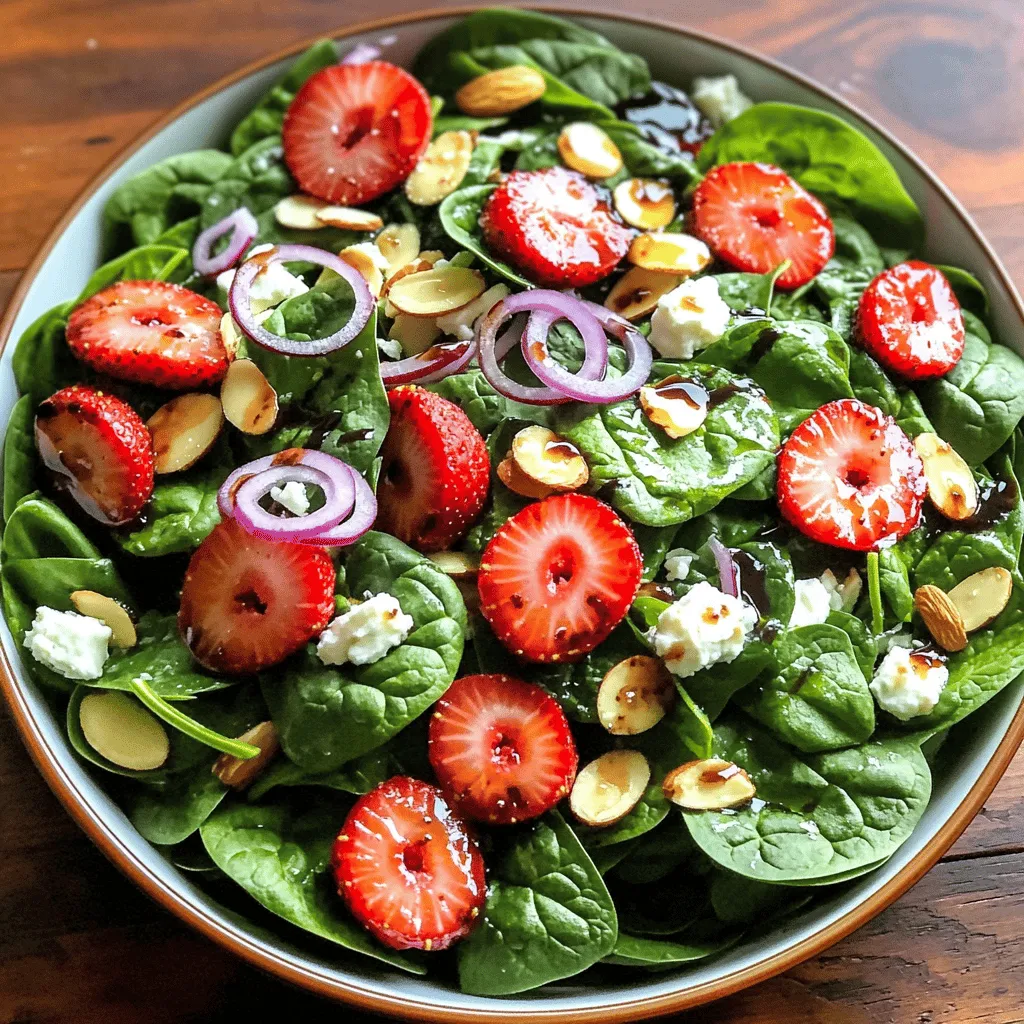 Start by mixing the key ingredients. In a large salad bowl, place 4 cups of fresh baby spinach. Then, add 1 cup of hulled and sliced strawberries. Toss them gently to mix. This blend creates a fresh and vibrant base for your salad.