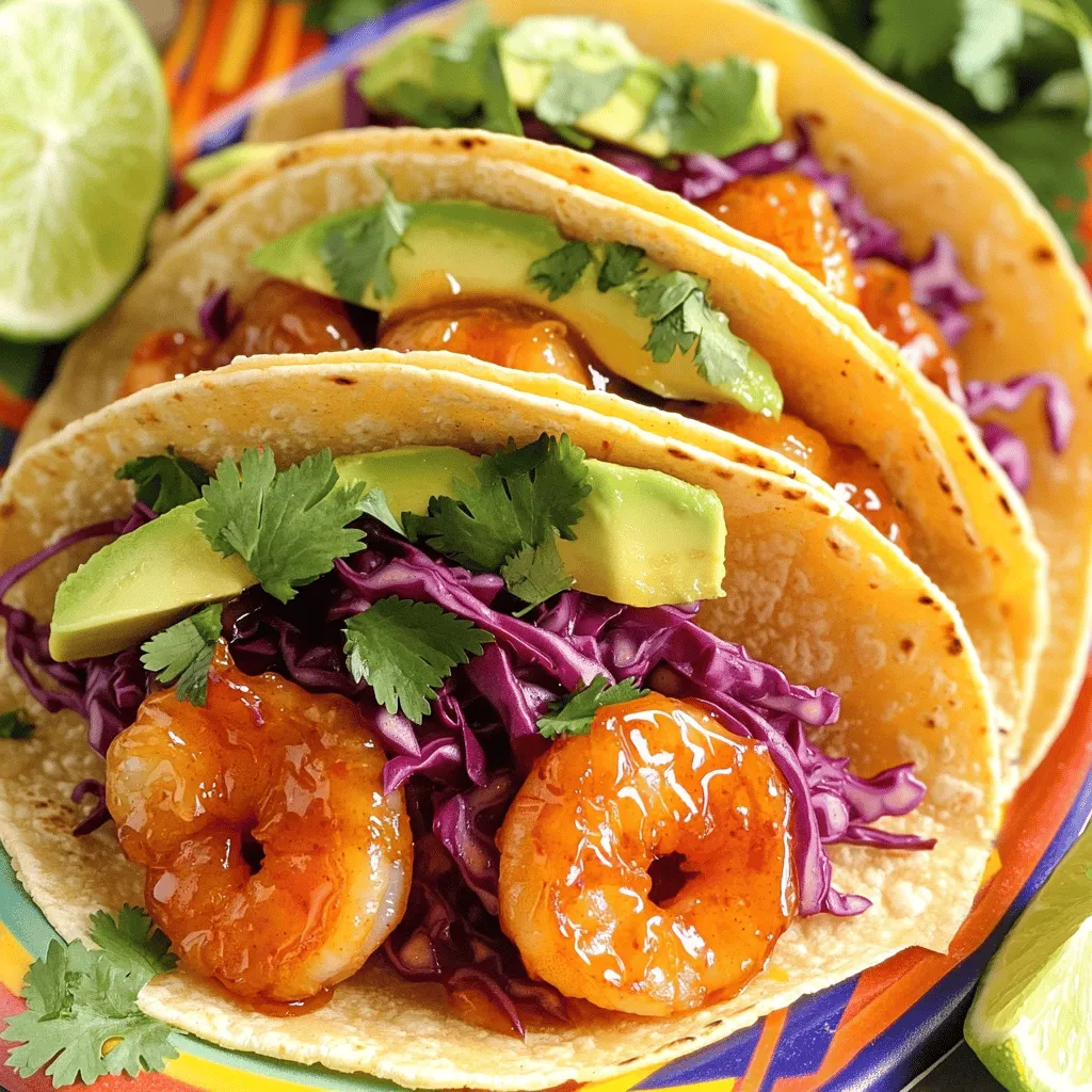 - 1 lb large shrimp, peeled and deveined - 2 tablespoons olive oil - 2 tablespoons honey - 1 tablespoon sriracha (adjust to your spice preference) - 1 teaspoon garlic powder - 1 teaspoon smoked paprika - Zest and juice of 1 lime - 8 small corn tortillas - 1 cup red cabbage, finely shredded - 1 avocado, sliced - Fresh cilantro, for garnish - Lime wedges, for serving - Salt and pepper, to taste You need these fresh ingredients for sweet and spicy shrimp tacos. The shrimp are the star. They soak up all the great flavors. The olive oil helps them cook perfectly. Honey adds a touch of sweetness. Sriracha brings the heat, so you can adjust it to your taste. Garlic powder and smoked paprika give depth to the dish. The lime zest and juice brighten the flavors. Corn tortillas hold everything together and add a nice texture. Red cabbage adds crunch, while avocado brings creaminess. Fresh cilantro adds a pop of color and flavor. Don't forget lime wedges for extra zing. For more details, check the Full Recipe. In a large bowl, I combine the olive oil, honey, sriracha, garlic powder, smoked paprika, lime zest, lime juice, salt, and pepper. This mix brings sweet and spicy flavors together. You can adjust the sriracha to make it hotter or milder. Next, I add the shrimp to the bowl. I toss the shrimp until they are evenly coated with the marinade. Then, I let them sit for 15 to 20 minutes. This step helps the shrimp soak up all those great flavors. I heat a non-stick skillet over medium-high heat. Once it’s hot, I add the marinated shrimp in a single layer. I cook them for 2 to 3 minutes on each side. When they turn pink and opaque, they are ready. This cooking time ensures they stay juicy. While the shrimp cook, I warm corn tortillas in a separate skillet. I heat them for about 30 seconds on each side. This makes them soft and pliable, perfect for holding all the tasty fillings. To build the tacos, I place a handful of shredded red cabbage on each tortilla. Then, I add a few shrimp on top. I finish with avocado slices and garnish with fresh cilantro. Each bite packs a punch of flavor. For a complete meal, serve with lime wedges for extra zest. For the full recipe, check out the detailed instructions above. For a balanced flavor, you can adjust the spice level. If you want more heat, add more sriracha. If you prefer less spice, simply use less. This will help you enjoy the dish just the way you like it. Cooking shrimp perfectly is key. Make sure your skillet is hot before adding the shrimp. Cook them for just 2-3 minutes on each side. They should turn pink and opaque. Overcooking makes them tough, so watch them closely. A beautiful taco platter makes a real impact. Arrange the tacos neatly on a vibrant plate. Add lime wedges around the tacos for a pop of color. Finish with a sprinkle of fresh cilantro on top. This simple touch makes your meal look fantastic. For the full recipe, check out the Sweet and Spicy Shrimp Tacos section. {{image_2}} You can switch shrimp for other proteins. Chicken works great in this dish. Just cut it into small pieces and cook it until done. Tofu is another good choice. Press it to remove water, then cube it. Fish is also an option; choose a firm type like tilapia or cod. Each protein adds its own flavor. Want to mix it up? Try adding mango salsa. It brings a sweet and tangy flavor that pairs well. You can also add jalapeños if you want more heat. Slice them thin and sprinkle on top. These extras make your tacos even more fun and tasty. The type of taco shell can change everything. Soft corn tortillas are traditional, but hard shells are great too. You can add toppings like cheese or sour cream. Cheese can add a creamy texture, while sour cream cools the heat. Play with different styles to find your favorite. For the full recipe, check out the Sweet and Spicy Shrimp Tacos. To keep leftover shrimp and toppings fresh, follow these steps: - Place shrimp in an airtight container. - Store shredded cabbage and avocado in separate containers. - Seal everything tightly to avoid air exposure. - Refrigerate leftovers within two hours of cooking. This will keep your shrimp tasty for up to three days. To reheat shrimp without losing texture, try these methods: - Use a skillet over medium heat. - Add a splash of water and cover to steam gently. - Heat for about two to three minutes until warmed. This keeps the shrimp juicy and avoids rubbery bites. If you want to freeze shrimp, follow these tips: - Lay shrimp flat on a baking sheet. - Freeze for about one hour until firm. - Then transfer to a freezer bag, removing as much air as possible. Keep shrimp and toppings separate to maintain their flavors. For best taste, use frozen shrimp within three months. For the full recipe, check out the Sweet and Spicy Shrimp Tacos section. You can store leftover tacos for up to two days. Place them in an airtight container. Keep the shrimp and toppings separate. This helps maintain texture and flavor. When ready to eat, reheat the shrimp in a skillet. Avoid microwaving, as it can make them rubbery. Yes, you can prepare components ahead of time. Marinate the shrimp and store them in the fridge for up to 24 hours. Warm the tortillas just before serving. You can also slice the avocado and shred the cabbage a few hours before. This way, you save time and enjoy fresh flavors. These tacos pair well with many sides. Here are a few ideas: - Mexican street corn - Black bean salad - Cilantro lime rice - Fresh guacamole - Salsa and tortilla chips These sides add flavor and complement the tacos perfectly. The spice level depends on your taste. The recipe uses one tablespoon of sriracha. You can adjust this amount to control the heat. For less spice, reduce the sriracha. For more heat, add extra sriracha or diced jalapeños. Try tasting the marinade before adding shrimp to find your ideal balance. Sweet and spicy shrimp tacos are simple and fun to make. We covered key ingredients and steps for a tasty meal. You le