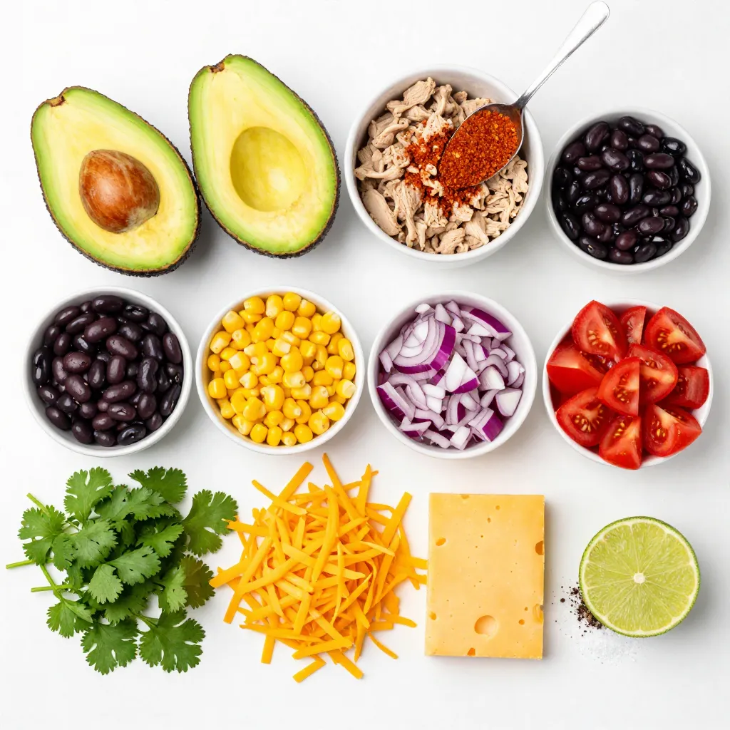 These ingredients bring bold flavors and vibrant colors to the dish. Ripe avocados are key for a creamy base. Ground turkey or beef adds protein. Taco seasoning gives it that classic taste. Black beans and corn add texture and nutrition. Diced tomatoes and red onion bring freshness. Shredded cheese melts perfectly on top. Fresh cilantro brightens the dish with its herbal notes. Lime juice adds a tangy kick. Salt and pepper enhance all the flavors. You can mix in optional toppings to customize your avocado. Enjoy creating this tasty treat!
