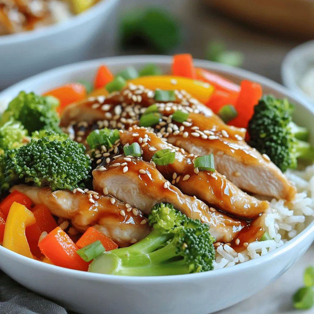 ![To make delicious teriyaki chicken bowls, you need the right ingredients. Here’s what you'll use: - 1 lb (450g) chicken breast, thinly sliced - 1 cup broccoli florets - 1 cup bell pepper (any color), sliced - 1/2 cup carrot, julienned - 1 cup cooked jasmine rice - 1 tablespoon sesame oil - 1 tablespoon olive oil These main ingredients are key to creating a tasty meal. The chicken gives protein, while the veggies add color and crunch. Jasmine rice provides a nice base, soaking up the flavors. The teriyaki sauce makes this dish shine. You will need: - 3 tablespoons soy sauce (low sodium) - 2 tablespoons honey - 1 tablespoon rice vinegar - 1 teaspoon ginger, minced - 1 garlic clove, minced - 1 tablespoon cornstarch mixed with 2 tablespoons water (slurry) This sauce blends sweet and salty. The ginger and garlic enhance the flavor, making it fragrant. To make your bowls look special, add these garnishes: - Sesame seeds - Green onions, chopped These not only look great but also add extra taste. A sprinkle of sesame seeds makes a lovely crunch, while green onions bring a fresh bite. Now you have all the ingredients you need for a simple yet flavorful meal. For the full recipe, check the detailed instructions to bring it all together. To make the teriyaki sauce, start by whisking together these ingredients in a bowl: - 3 tablespoons soy sauce (low sodium) - 2 tablespoons honey - 1 tablespoon rice vinegar - 1 teaspoon minced ginger - 1 minced garlic clove - 1 tablespoon sesame oil This mix gives your dish a sweet and salty flavor. After combining, set aside half of the sauce in another bowl. You’ll use this later for extra flavor. Next, heat 1 tablespoon of olive oil in a large skillet or wok over medium-high heat. Once the oil is hot, add 1 pound of thinly sliced chicken breast. Cook for about 5 to 7 minutes. Stir the chicken often. You want it to be cooked through and slightly brown for the best taste. Now it’s time to add veggies! Toss in 1 cup of broccoli, 1 cup of bell pepper, and 1/2 cup of julienned carrots to the skillet. Stir-fry them with the chicken for about 3 to 4 minutes. The veggies should be tender but still crisp. When the veggies are ready, pour the reserved teriyaki sauce over the chicken and vegetables. Bring this mixture to a simmer. To thicken the sauce, add 1 tablespoon of cornstarch mixed with 2 tablespoons of water, stirring continuously. Cook for an additional 2 to 3 minutes. The sauce should coat everything nicely. Now you are ready to assemble your Teriyaki Chicken Bowls! Check the [Full Recipe] for more details. For the best results, use a large skillet or wok. These pans heat evenly and allow for easy stirring. Cook the chicken and veggies over medium-high heat. This temperature helps the chicken cook through and brown nicely without burning. Always use fresh ingredients when possible. Fresh ginger and garlic bring a bright flavor. Dried ingredients can work in a pinch, but they lack the same punch. Adjust the sweetness and saltiness of the sauce to suit your taste. If you want it sweeter, add more honey. For more saltiness, increase the soy sauce. Plating your teriyaki chicken bowl can make a big difference. Start with a base of jasmine rice. Arrange the chicken and veggies on top in a colorful way. For garnishing, sprinkle sesame seeds and chopped green onions. This adds a nice touch and makes the meal look inviting. {{image_2}} You can switch out chicken for other proteins. Tofu is a great choice for a plant-based meal. It soaks up flavors well. Shrimp also cooks fast and adds a nice touch. For veggies, try snap peas or zucchini. These choices give a different taste and texture. You can even mix in mushrooms for an earthy flavor. Each combination can change your bowl completely. You can make the teriyaki sauce fit your needs. Use tamari instead of soy sauce for a gluten-free option. If you want heat, add some chili flakes or sriracha. This will give your dish a spicy kick. Feel free to add garlic powder or sesame seeds to the sauce. These small tweaks can enhance the overall flavor and make it your own. Rice is a classic base for teriyaki chicken bowls. Jasmine rice is light and fluffy, but you can use brown rice for more fiber. Quinoa is another good option if you want more protein. You can also serve your teriyaki chicken with noodles. Udon or rice noodles work well. For a full meal, add sides like edamame or a simple green salad. This creates a balanced and satisfying dinner. After making Teriyaki Chicken Bowls, you may have some leftovers. Store them in airtight containers. Glass containers work well, as do plastic ones. Make sure they are sealed tightly to keep air out. In the refrigerator, your Teriyaki Chicken Bowls will last for 3 to 4 days. If you want to keep them longer, freeze them. In the freezer, they can last for about 2 to 3 months. Just remember to label the containers with the date. When you’re ready to eat your leftovers, reheating is simple. You can use a microwave or a stove. If using a microwave, place the bowl in and heat for 1 to 2 minutes. Stir halfway to ensure even heating. On the stove, add a little water to a pan. Heat the bowl over low to medium heat. Stir often, so everything warms evenly. This way, you keep the flavor and texture intact. Teriyaki Chicken Bowls are great for meal prep. You can make them ahead of time for busy weeknights. Start by cooking the chicken and veggies as the recipe states. You can also prep ingredients in advance. Chop the broccoli, bell pepper, and carrot the night before. Store them in the fridge in separate bags. This makes assembly quick and easy. You can cook the rice fresh or make a big batch to use throughout the week. For the full recipe, check the instructions above. To make Teriyaki Chicken Bowls from scratch, you start with the sauce. Whisk soy sauce, honey, rice vinegar, ginger, garlic, and sesame oil in a bowl. Set aside half for later. Next, heat olive oil in a large skillet. Add sli
