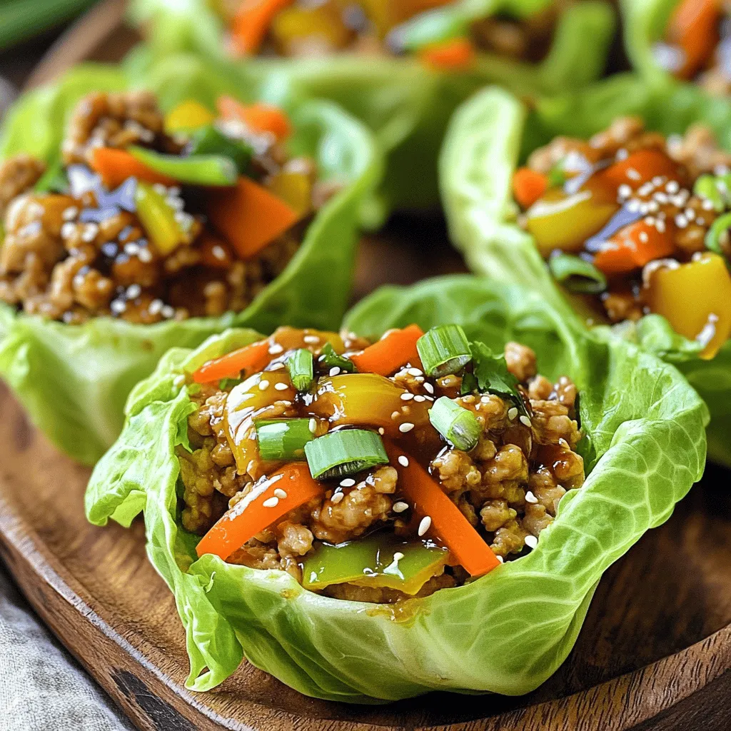 Once the chicken mixture is ready, remove it from the heat. Stir in the sliced green onions and sesame seeds. This adds a nice crunch and flavor. Now, take your butter or romaine lettuce leaves and separate them. Spoon the teriyaki chicken mixture into the center of each leaf. You can fold the sides over to create a cup. Arrange the filled lettuce cups on a platter. For a fun touch, garnish with extra sesame seeds and green onions! Enjoy your fresh and flavorful teriyaki chicken lettuce cups!