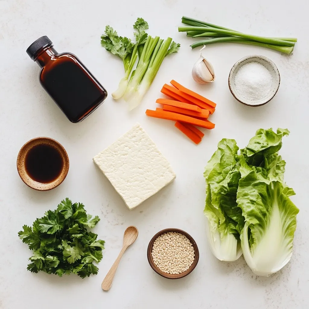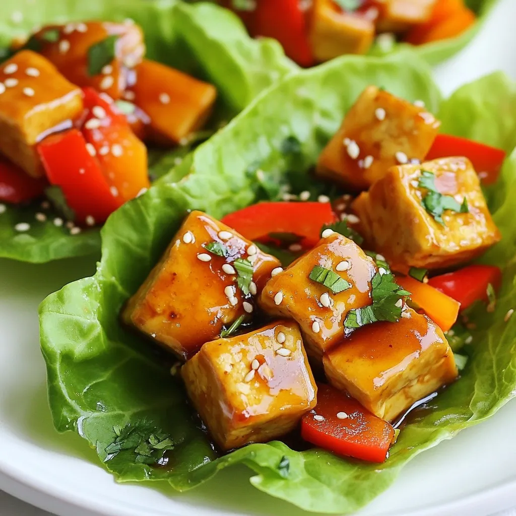 - 1 block firm tofu, drained and pressed - 1 tablespoon sesame oil - 1/4 cup soy sauce (or tamari for gluten-free) - 2 tablespoons maple syrup - 1 tablespoon rice vinegar - 1 red bell pepper, finely diced - 1 carrot, julienned - 4 green onions, chopped - 1 head of butter lettuce or romaine, leaves separated - Sesame seeds and chopped cilantro for garnish - 1 garlic clove, minced - 1 teaspoon fresh ginger, grated - 1 tablespoon cornstarch mixed with 2 tablespoons water (slurry) These ingredients come together to create a dish that is both healthy and tasty. Firm tofu is the star of the show, providing protein and a smooth texture. The sesame oil adds a nutty flavor, while soy sauce or tamari brings the salty umami taste. Maple syrup balances the flavors with sweetness, and rice vinegar adds some tang. Next, the vibrant veggies like red bell pepper and carrot give crunch and color. Green onions add a fresh bite, while butter lettuce acts as a perfect wrap. Don't forget the sesame seeds and cilantro for that finishing touch! The garlic and ginger bring warmth and depth to the dish. Using a cornstarch slurry helps thicken the sauce, ensuring each bite is full of flavor. This mix of fresh ingredients makes these teriyaki tofu lettuce wraps a must-try meal for any occasion. {{ingredient_image_1}} 1. Start by draining your firm tofu. Press it to remove extra water. 2. Cut the pressed tofu into small cubes. Aim for even sizes for even cooking. 1. In a large skillet, add one tablespoon of sesame oil. Heat it over medium heat. 2. Once hot, add the tofu cubes. Cook them until they are golden brown, about 6 to 8 minutes. 1. In a bowl, mix the following ingredients well: - 1/4 cup soy sauce (or tamari for gluten-free) - 2 tablespoons maple syrup - 1 tablespoon rice vinegar - 1 minced garlic clove - 1 teaspoon grated fresh ginger - 1 tablespoon cornstarch mixed with 2 tablespoons water 2. Pour this sauce over the cooked tofu. Stir well to coat it evenly. Cook for an extra 2 to 3 minutes until the sauce thickens. 1. Add the diced red bell pepper and julienned carrot to the tofu. Cook for another 2 minutes. The veggies should be just tender. 2. Remove the skillet from heat and stir in the chopped green onions. 1. Take a leaf of butter lettuce or romaine. Spoon some of the teriyaki tofu mixture onto the center. 2. Garnish with sesame seeds and chopped cilantro. 3. Fold the lettuce over the filling, making a wrap. Enjoy your tasty meal! To press tofu, start by placing the block on a plate. Add another plate on top, then put something heavy on it. This helps remove excess water. Let it sit for at least 15 minutes. For good browning, use medium heat. This allows the tofu to cook evenly and get crispy. To add more flavor, try garlic powder or red pepper flakes. You can also mix in some chopped nuts for crunch. If your dish is too sweet, add a splash of soy sauce. If it’s too salty, a bit of maple syrup can help balance it out. Serve your wraps with rice or a light salad. You can also pair them with a spicy dipping sauce. To make your dish look nice, stack the lettuce wraps on a plate. Add a sprinkle of sesame seeds and fresh cilantro on top for color. Pro Tips Press Tofu Well: Make sure to press the tofu thoroughly to remove excess moisture, allowing it to absorb the marinade better and achieve a crispier texture. Customize Your Vegetables: Feel free to add other vegetables like mushrooms or snap peas for extra flavor and texture in your wraps. Use Fresh Herbs: Fresh cilantro adds a burst of flavor; consider adding mint or basil for a different twist on the classic taste. Adjust Sauce Thickness: If you prefer a thicker sauce, let it reduce longer in the pan, stirring frequently to prevent sticking. {{image_2}} You can change the flavor with different sauces. A homemade teriyaki sauce is simple. Just mix soy sauce, maple syrup, rice vinegar, and garlic. You can also try a sweet chili sauce for a spicy kick. For store-bought options, look for sauces labeled "teriyaki" or "Asian stir-fry." Tofu is great, but you can switch it up. Try chickpeas for a hearty bite. Tempeh works well too; it has a nutty flavor. If you eat meat, chicken or shrimp can add protein. Just cook them well before adding the sauce. Crunchy veggies make your wraps exciting. Try adding cucumber or radishes for a fresh bite. You can also use seasonal veggies like zucchini in summer or carrots in winter. These add color and nutrients to your meal. To keep your teriyaki tofu fresh, store it in an airtight container. Place wax paper between layers to prevent sticking. You can store the tofu mixture and lettuce leaves separately. This method keeps the lettuce crisp. Your leftovers will stay fresh for about three days in the fridge. To reheat the tofu, use a non-stick skillet. Heat it on medium-low heat to keep the texture nice. Add a splash of water to help steam the tofu. You can also use a microwave. Heat it in 30-second bursts, checking the texture after each round. Yes, you can freeze teriyaki tofu! To freeze, cool the tofu completely and place it in a freezer bag. Remove as much air as possible before sealing. When you're ready to eat it, thaw it in the fridge overnight. Reheat it in a skillet for the best texture. Yes, this recipe can be gluten-free. You can use tamari instead of soy sauce. Tamari is a gluten-free soy sauce that gives a similar taste. Always check labels to ensure no gluten is present. Absolutely! You can use chickpeas, lentils, or even tempeh as substitutes. These options provide great flavor and protein, making the dish still filling. These wraps pair well with many sides. Consider serving them with: - Brown rice - Quinoa - Steamed vegetables - A light salad These sides add nutrition and flavor to your meal. To store the wraps, separate the filling from the lettuce. Keep the filling in an airtight container in the fridge for up to three days. Store the lettuce leaves in a separate bag. This keeps them fresh and crisp. Th
