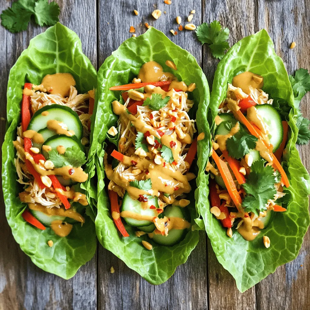 - 2 cups cooked chicken, shredded - 1/2 cup peanut butter (or almond butter) - 1 tablespoon lime juice - 1 cup shredded carrots - 1 cup cucumber, julienned - 1 red bell pepper, thinly sliced - 1/4 cup fresh cilantro, chopped - 1/4 cup chopped peanuts - Optional: Red pepper flakes When I create Thai Peanut Chicken Wraps, I focus on fresh and simple ingredients. The main star is the chicken. You can use leftover rotisserie chicken or grill it fresh. This saves time and adds great flavor. Peanut butter gives the wraps a creamy texture. You can swap it with almond butter for a nutty twist. Lime juice adds a bright, zesty kick. It balances the creamy peanut butter perfectly. Next, fresh vegetables bring crunch and color. Shredded carrots add sweetness and a nice bite. Cucumber gives a refreshing crunch, while the red bell pepper adds a pop of color and flavor. For garnishes, I love using fresh cilantro. It adds an herbaceous note that brightens the dish. Chopped peanuts offer a satisfying crunch. If you like heat, sprinkle red pepper flakes on top. You can find the full recipe [here]. This meal is quick and easy, making it perfect for busy nights. Enjoy every bite of these tasty wraps! 1. In a mixing bowl, combine peanut butter, soy sauce, lime juice, honey, minced garlic, and grated ginger. 2. Stir well until smooth to create the peanut sauce. 3. Adjust sweetness to taste by adding more honey if needed. 1. Take your cooked chicken and coat it with half of the peanut sauce. 2. Place a large lettuce leaf on a flat surface. 3. Add a generous amount of the chicken on the leaf. 4. Layer on shredded carrots, cucumber, red bell pepper slices, and chopped cilantro. 1. Carefully fold the lettuce leaves around the filling to create wraps. 2. If needed, secure the wraps with a toothpick. 3. Drizzle with the reserved peanut sauce or use it as a dipping sauce. You can find the full recipe for these delicious Thai Peanut Chicken Wraps in the previous sections. Enjoy your meal! To make the best peanut sauce, you can adjust the flavors. If you want it sweeter, add more honey. If you like it saltier, add more soy sauce. For a tangy kick, squeeze in extra lime juice. If the sauce is too thick, add a bit of water or more lime juice. For a thicker sauce, use less liquid or add more peanut butter. This sauce can change your wraps from good to great. For the best wraps, use Romaine or Butterhead lettuce. These lettuces are strong and hold the filling well. If you want to mix it up, try using rice paper or tortillas. Both options add a fun twist and make assembly easy. Each wrapper brings its own taste and texture. These wraps pair well with side dishes like fresh fruit or crispy veggie sticks. They also go great with a light salad. For drinks, try iced tea or coconut water. Both options keep the meal refreshing and light. Enjoy your wraps with these tasty sides and drinks for a complete meal. {{image_2}} You can switch the chicken for tofu or tempeh. These options are great for plant-based diets. Simply cut the tofu or tempeh into cubes. Then, cook them until golden brown. This adds a nice texture and flavor. If you want more taste, try slow-cooking chicken or tempeh. This method helps the flavors blend well. It also makes the dish juicy and rich. Spice up your wraps by adding chili paste or sriracha. This brings a kick and makes the wraps exciting. You can also experiment with herbs like basil or mint. These herbs add freshness and a unique taste. Consider trying sesame oil for a nutty flavor. It makes the peanut sauce even richer and more complex. If you need a gluten-free meal, use tamari instead of soy sauce. This simple swap keeps the taste but removes gluten. For a vegan version, replace chicken with chickpeas. Simply mash them and mix with the peanut sauce. It creates a creamy and tasty filling. You can still enjoy these wraps while meeting your dietary needs. For the Full Recipe, refer back to the earlier section on ingredients and instructions. To keep your Thai peanut chicken wraps fresh, wrap them tightly in plastic. This helps prevent air from drying them out. Place the wrapped wraps in an airtight container in the fridge. They stay good for about 2 to 3 days. After that, the veggies may lose their crunch. If you have extra wraps, freezing is a great choice. To freeze them, wrap each one in plastic wrap. Then place the wrapped wraps in a freezer-safe bag. This keeps them fresh for up to 3 months. When you're ready to eat, take one out and let it thaw in the fridge overnight. To reheat, you can warm them in a microwave for about 30 seconds. You might have extra peanut sauce or veggies after making these wraps. Use the sauce as a dip for fresh veggies or spread it on toast. You can also mix leftover veggies into a salad for a quick meal. If you have chicken left, toss it into a stir-fry or a grain bowl. These ideas help reduce waste and add variety to your meals. If you need an alternative, try these nut butters: - Almond butter - Cashew butter - Sunflower seed butter Each option gives a unique taste. Almond butter has a sweet flavor. Cashew butter is creamy and mild. Sunflower seed butter is great for nut allergies. Yes, you can prep this dish ahead of time. Here are some tips: - Make the peanut sauce in advance. - Store it in the fridge for up to a week. - Cook and shred the chicken ahead. - Chop veggies and keep them fresh in containers. Assemble the wraps just before serving for the best taste. To make these wraps more appealing to kids, try these adjustments: - Use less soy sauce for a milder flavor. - Skip the red pepper flakes if they like it mild. - Add sweet veggies like bell peppers or carrots. - Let kids help assemble their own wraps. These steps can make cooking fun and tasty for little chefs! These wraps offer a burst of flavor and nutrition. We covered the key ingredients, like chicken and fresh veggies, plus a rich peanut sauce. I shared tips for making and storing your wraps, along with 