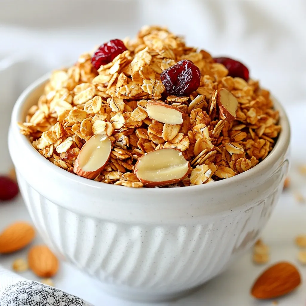To make delicious vanilla almond granola, you'll need a few basic ingredients: - 3 cups rolled oats - 1 cup sliced almonds - 1/2 cup honey or maple syrup - 1/4 cup coconut oil, melted - 1 teaspoon vanilla extract - 1/2 teaspoon cinnamon - 1/4 teaspoon salt These core ingredients create a perfect balance of taste and texture. The oats provide a chewy base, while almonds add crunch. Honey or maple syrup gives sweetness, and coconut oil helps everything stick together. You can easily customize your granola with a few optional ingredients: - 1 cup dried cranberries or raisins Adding dried fruit gives a sweet burst in each bite. You can also mix in nuts, seeds, or even coconut flakes. Experimenting with flavors makes this granola truly yours. This recipe serves about ten people. Each serving offers a good amount of fiber and healthy fats. The oats and nuts help keep you full and energized. - Calories: Approximately 200 per serving - Protein: 4 grams - Fiber: 3 grams - Sugar: 9 grams (if using honey) Always check the labels if you use different sweeteners or add-ins. This granola is a wholesome choice for breakfast or a snack. It is tasty, filling, and easy to make! {{ingredient_image_1}} To start, gather your ingredients. You will need: - 3 cups rolled oats - 1 cup sliced almonds - 1/2 cup honey or maple syrup - 1/4 cup coconut oil, melted - 1 teaspoon vanilla extract - 1/2 teaspoon cinnamon - 1/4 teaspoon salt - 1 cup dried cranberries or raisins (optional) First, preheat your oven to 300°F (150°C). This low heat helps the granola become crunchy. Next, line a large baking sheet with parchment paper. This step makes cleanup easy. In a big bowl, mix the rolled oats, sliced almonds, cinnamon, and salt. Stir well to blend these dry ingredients. This mix gives your granola a great base. Now, let’s create the wet mix. In a small saucepan, combine honey (or maple syrup), melted coconut oil, and vanilla extract. Heat it on low, stirring until smooth. This mixture adds sweetness and flavor. Pour the wet mix over the dry ingredients. Stir until everything is coated. This step is key for even flavor. Spread the granola mix evenly on your lined baking sheet. Bake it in the preheated oven for 25-30 minutes. Make sure to stir halfway through. This ensures even baking and a lovely golden color. Once your granola is golden brown, take it out of the oven. Let it cool completely on the baking sheet. This cooling step helps it become crunchy. If you want to add dried cranberries or raisins, do that now. Mix them in well. Finally, store your granola in an airtight container. It will stay fresh at room temperature for up to two weeks. Enjoy your tasty snack! To make crunchy granola, focus on the baking time and temperature. Bake at 300°F (150°C) for about 25 to 30 minutes. Stir halfway through to ensure even browning. Watch closely for a golden color. If you want it crunchier, leave it in the oven a bit longer. Just be careful not to burn it! You can swap ingredients to suit your needs. If you have a nut allergy, try seeds like sunflower or pumpkin. Use agave syrup or brown rice syrup instead of honey for a vegan option. If you dislike coconut oil, olive oil or butter works well too. Feel free to adjust ingredients based on what you like! Want to jazz up your granola? Add fun flavors! Try mixing in dark chocolate chips after baking for a sweet treat. You can also add spices like nutmeg or ginger for a kick. Fresh fruits like banana chips or apple pieces mix in nicely too. Experiment to find your favorite blend! Pro Tips Use Fresh Ingredients: Always use fresh rolled oats and nuts to enhance the flavor and crunchiness of your granola. Customize Your Sweetener: Feel free to substitute honey with maple syrup or agave nectar for a vegan option or to tweak the sweetness to your preference. Don’t Skip the Stirring: Stir the granola halfway through baking. This prevents burning and ensures even browning for a perfect crunch. Store Properly: Keep your granola in an airtight container to maintain freshness and prevent it from becoming soggy. {{image_2}} You can change the nuts in this granola. Try walnuts, pecans, or hazelnuts. Each nut adds its own flavor and crunch. Seeds are also a great choice. Use pumpkin seeds or sunflower seeds for extra nutrients. Mixing different nuts and seeds keeps your snacks fun and tasty. Want to spice up your granola? You can add different flavors easily. Try using almond extract instead of vanilla for a nutty twist. You can also mix in cocoa powder for a chocolate flavor. Add orange or lemon zest for a fresh taste. Each flavor will give your granola a new life. You can boost the nutrition of your granola with simple add-ins. Mixing in protein powder helps keep you full. Superfoods like chia seeds or flaxseeds give extra fiber and omega-3s. Adding dried fruits can increase vitamins and sweetness too. These small changes make your granola not just tasty but healthy as well. To keep your vanilla almond granola fresh, store it in an airtight container. Choose a container that seals well to keep air out. Glass jars or plastic bins work great. Make sure to place it in a cool, dry place. Avoid direct sunlight to prevent moisture. To extend the shelf life of your granola, consider freezing it. Place portions in freezer-safe bags. Remove as much air as possible before sealing. When you want to eat some, just thaw it at room temperature. This method can keep it fresh for up to three months. Check your granola for signs of staleness. If it feels soft or loses its crunch, it’s time to toss it. Also, look for any off smells or unusual colors. If you see any mold, discard it immediately. Keeping your granola fresh helps you enjoy every bite! Yes, you can use quick oats. However, the texture will change. Quick oats cook faster and can become mushy. Rolled oats keep a nice crunch. I recommend using rolled oats for the best result. Homemade granola lasts up to two weeks. Store it in an airtight 