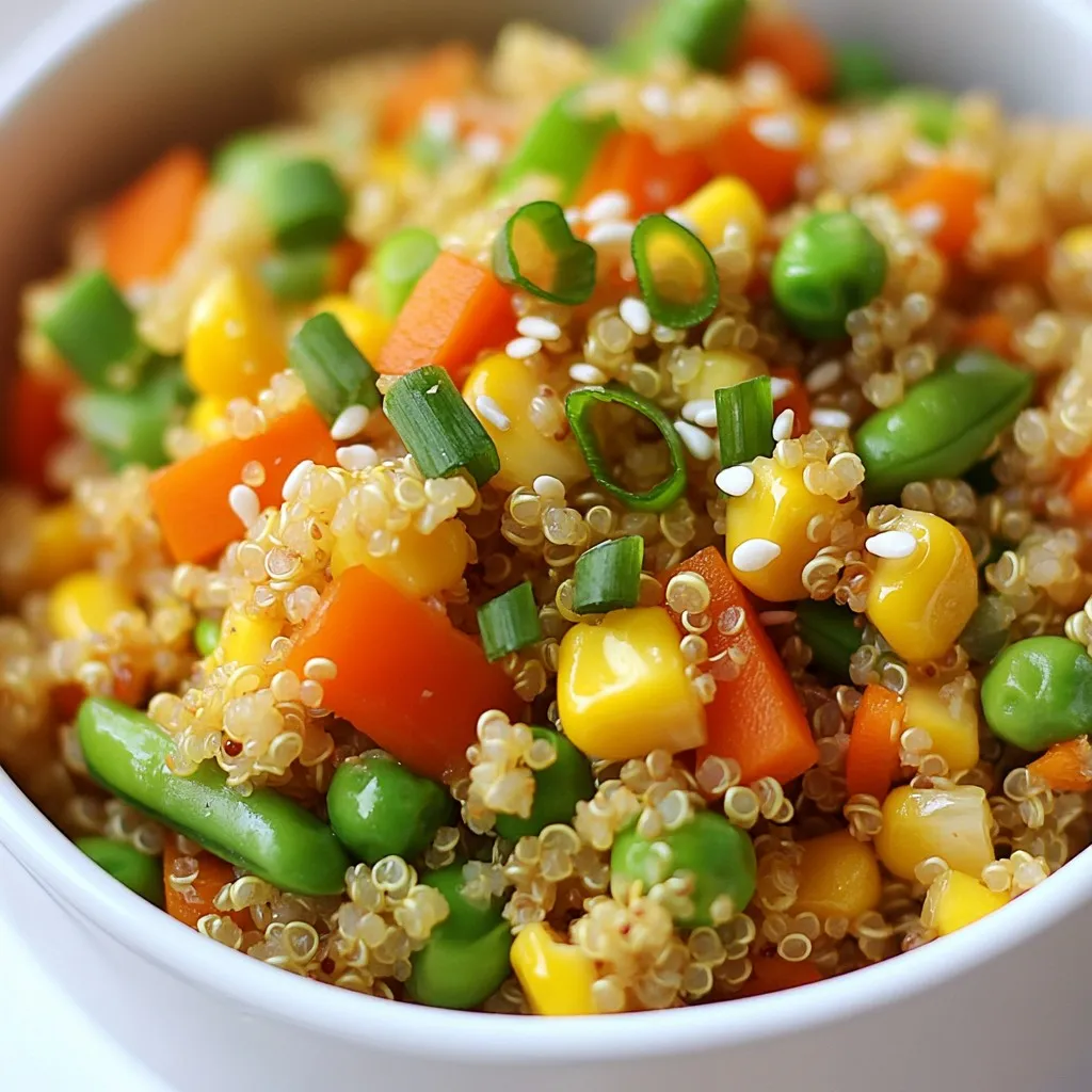To get the best texture in your Veggie Loaded Quinoa Fried Rice, rinse the quinoa well. This step removes the bitter coating called saponin. When you cook it, use vegetable broth for added flavor. This gives the quinoa a richer taste. Fluff the quinoa after cooking to keep it light and airy.