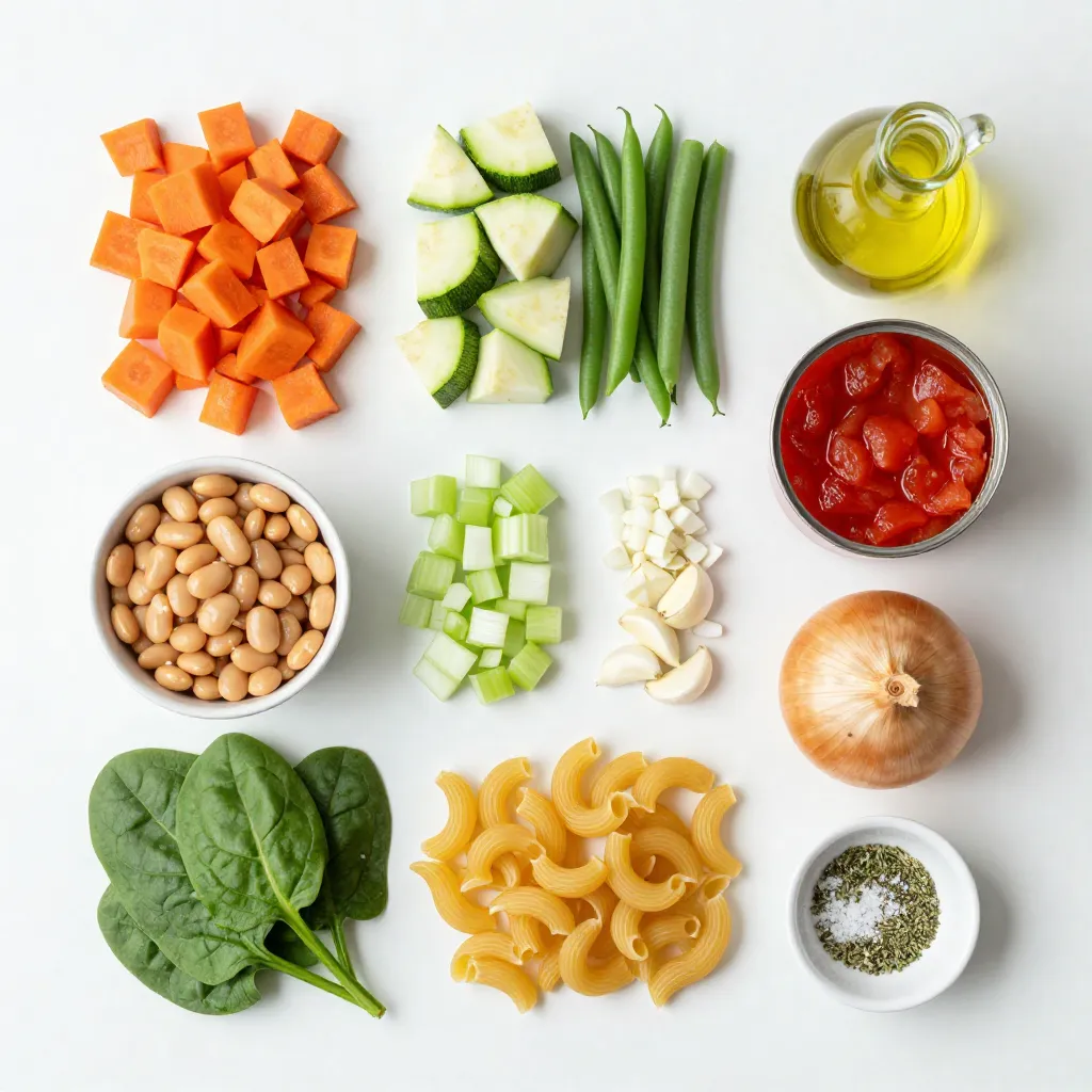 Next, I reach for pantry staples. Olive oil brings richness to the soup. Canned diced tomatoes add sweetness and acidity. Vegetable broth is key for depth. The cannellini beans give protein and creaminess. I love to use elbow pasta, but any small pasta works well. Dried Italian herbs tie all the flavors together. Salt and pepper round out the taste perfectly.