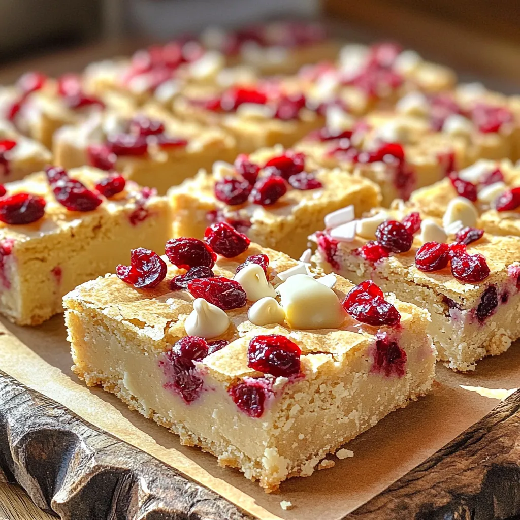 These ingredients create a sweet and rich base for your blondies. The blend of white chocolate and cranberries adds a nice balance of flavors.