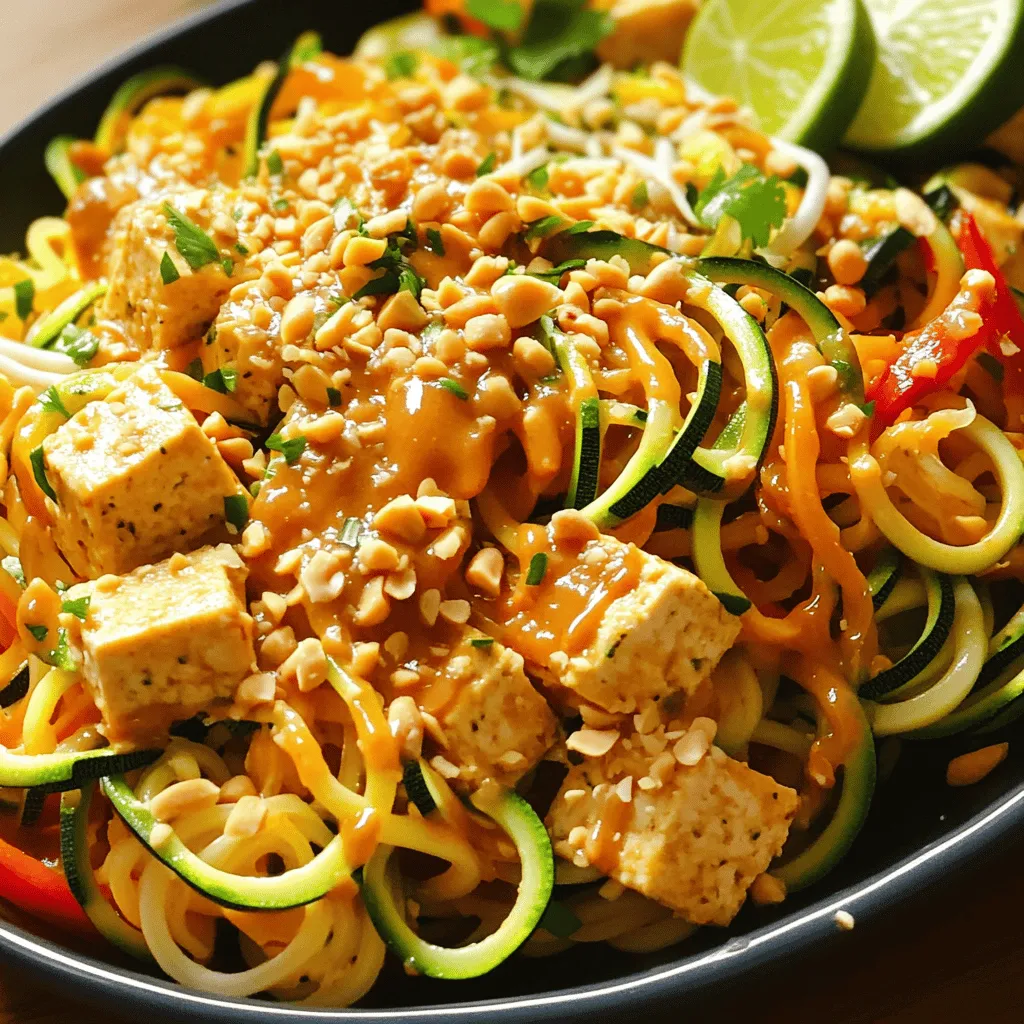 Now, add the zucchini noodles to the skillet. Toss them with the garlic and bell pepper for 2-3 minutes. You want the zoodles to be just tender. Next, mix tamari or soy sauce, peanut butter, lime juice, and coconut sugar in a small bowl. Pour this sauce over the zoodles and veggies. Add back the cooked tofu, bean sprouts, and green onions. Toss everything well for 1-2 minutes. This allows the sauce to coat every bite. Serve your Zucchini Noodle Pad Thai hot. Top with crushed peanuts and lime wedges for extra flavor.
