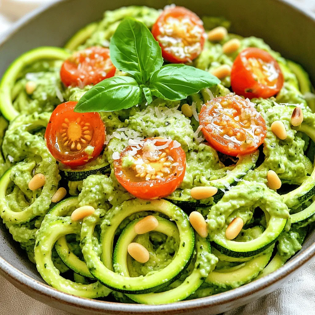 When I make zucchini noodles with pesto, I focus on fresh, simple ingredients. Zucchini noodles serve as a great base. They soak up flavor and bring a nice crunch. Avocado adds creaminess and healthy fats. Fresh basil gives the dish an aromatic kick. Pine nuts add a bit of crunch. Garlic and lemon juice brighten the flavors. Olive oil ties everything together. You can adjust salt and pepper to fit your taste.