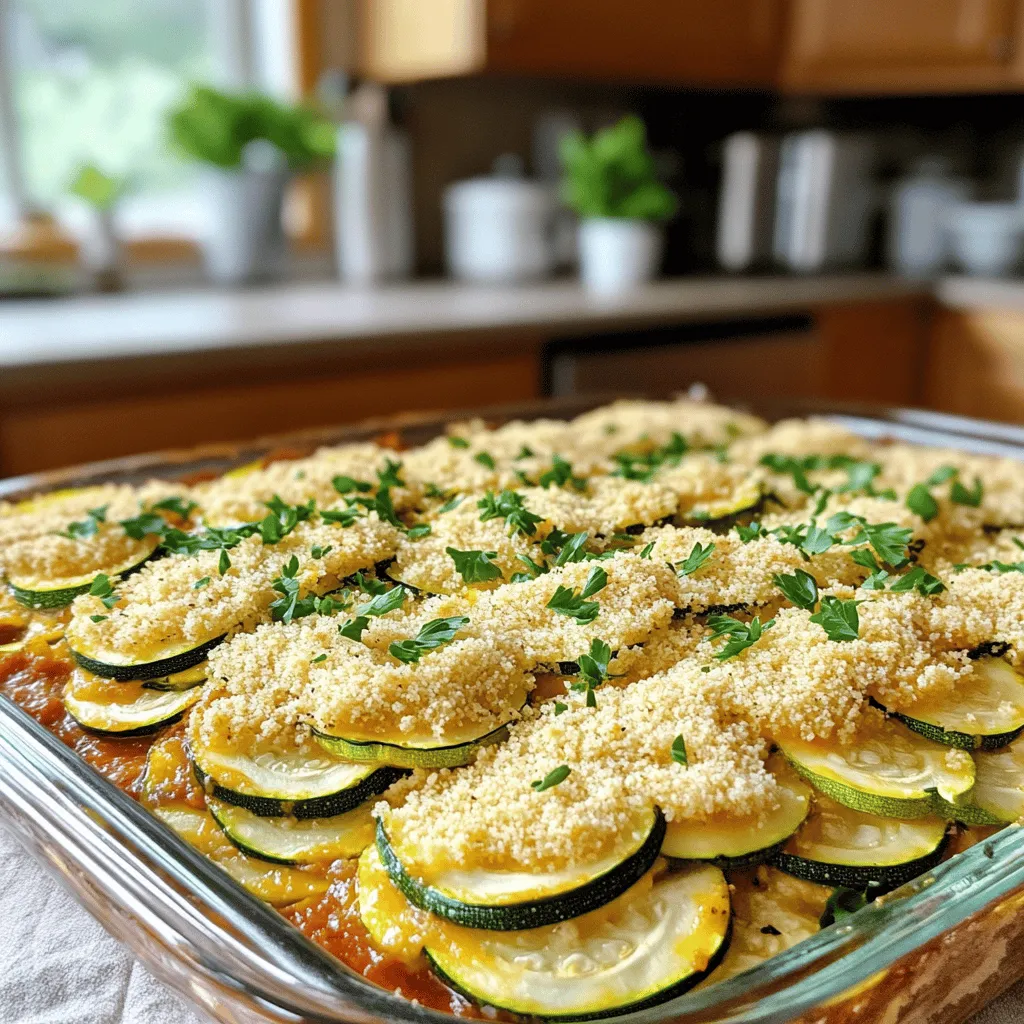 To make a tasty Zucchini Parmesan Bake, you'll need some simple ingredients. Here’s the list: - 4 medium zucchinis, sliced into thin rounds - 1 cup breadcrumbs (panko for extra crunch) - 1 cup grated Parmesan cheese - 2 cups marinara sauce (homemade or store-bought) - 1 cup shredded mozzarella cheese - 2 cloves garlic, minced - 1 teaspoon dried oregano - 1 teaspoon dried basil - Salt and pepper to taste - Fresh parsley for garnish Each ingredient plays a key role. The zucchini gives a fresh taste. The cheeses add creaminess and flavor. The marinara sauce brings a rich, tangy layer. For the best taste, I have some brand suggestions: - Panko Breadcrumbs: Kikkoman or Japanese brand are great for crunch. - Parmesan Cheese: Grana Padano or BelGioioso offer strong flavors. - Marinara Sauce: Rao’s Homemade or Classico for a rich taste. Using these brands can help boost your dish's flavor. They provide quality that can make your Zucchini Parmesan Bake even better. You can swap some ingredients if needed. Here are some ideas: - Zucchini: Yellow squash or eggplant work well too. - Breadcrumbs: Use crushed crackers for a different texture. - Parmesan Cheese: Pecorino Romano gives a saltier taste. - Mozzarella Cheese: Any melty cheese, like provolone, can replace it. These swaps can change the dish while keeping it delicious. Feel free to experiment and find what you love most in your Zucchini Parmesan Bake. For the full recipe, check out the link provided earlier. Start by preheating your oven to 375°F (190°C). This step is key to getting the cheese bubbly and golden. Next, grease a large baking dish with olive oil or cooking spray. This will help the dish cook evenly and make cleanup easier. Now, let’s prepare the breadcrumb mixture. In a medium bowl, combine the breadcrumbs, grated Parmesan cheese, minced garlic, dried oregano, dried basil, salt, and pepper. Mix well to ensure the flavors blend together. Set this aside for later. The fun part comes next! Begin layering half of the sliced zucchini in your baking dish. Make sure to spread the slices evenly. After the zucchini, sprinkle half of your breadcrumb mixture over the top. Then, pour half of the marinara sauce over that. Finally, add half of the shredded mozzarella cheese. Repeat this process with the remaining ingredients. Layer the rest of the zucchini, followed by the breadcrumb mixture, marinara sauce, and mozzarella cheese. This layering builds flavor and texture in every bite. Cover your dish with aluminum foil. This will trap moisture and cook the zucchini well. Bake it in the preheated oven for 25 minutes. After that, remove the foil. Continue baking for about 15 more minutes. You want the cheese to be bubbly and golden brown. Once it’s done, take it out of the oven and let it stand for 5-10 minutes. This allows the dish to set and makes serving easier. Before plating, garnish with fresh parsley for a pop of color and flavor. For the full recipe, check out the earlier sections. Enjoy your delicious Zucchini Parmesan Bake! When picking zucchini, look for firm ones. They should feel heavy for their size. Choose ones with smooth skin and bright color. Avoid any with blemishes or soft spots. These signs mean they may be old or spoiled. Fresh zucchini makes your dish taste great and keeps its texture. To cook zucchini evenly, slice it into thin rounds. Thin slices cook faster and evenly. Layer your zucchini in a baking dish without crowding. This helps heat circulate and cooks them well. For melting cheese, use a mix of mozzarella and Parmesan. These cheeses melt nicely and give a tasty topping. One mistake is not salting zucchini before baking. Salt helps draw out excess moisture. If you skip this step, your bake may turn out soggy. Another mistake is not covering the dish. Covering it keeps moisture in for the first part of cooking. Lastly, don't forget to let it sit after baking. This helps flavors meld and makes serving easier. For more details, check out the Full Recipe. {{image_2}} To make your Zucchini Parmesan Bake even better, try adding fresh herbs. Chopped basil or thyme brings a bright taste. You can also mix in other veggies, like bell peppers or mushrooms. These add color and texture. A pinch of red pepper flakes can give it a nice kick. If you love garlic, add an extra clove or two. This will boost the flavor in every bite. This dish is easy to make vegetarian or vegan. For a vegan version, swap the cheeses for plant-based options. Nutritional yeast can give a cheesy flavor without dairy. Use vegan breadcrumbs to keep it plant-based. Check the marinara sauce too; some brands have added sugars or fats that are not vegan. This way, you can enjoy a tasty meal that fits your diet. Zucchini Parmesan Bake is great on its own, but you can serve it with sides. A fresh salad with a light vinaigrette adds a nice crunch. Garlic bread is a popular choice too. For a more filling meal, pair this dish with pasta or quinoa. It’s also perfect for lunch the next day. Serve it warm and enjoy the leftovers with a sprinkle of fresh herbs on top. For more details, check the Full Recipe. To store leftovers, let the dish cool down first. Place the Zucchini Parmesan Bake in an airtight container. This keeps it fresh. You can store it in the fridge for up to three days. If you notice any moisture, use a paper towel to absorb it. When you are ready to enjoy leftovers, preheat your oven to 350°F (175°C). Place the Zucchini Parmesan Bake in an oven-safe dish. Cover it with foil to keep it moist. Heat for about 15-20 minutes. You want the cheese to melt again and the dish to be warm. You can also use a microwave for quick reheating. Heat it in 30-second intervals, stirring in between. If you want to keep it longer, freezing is a great option. Cut the bake into portions and wrap each piece in plastic wrap. Then, place the wrapped pieces in a freezer-safe bag. Remove as much air as possible. You can freeze Zucchini Parmesan Bake for up to t
