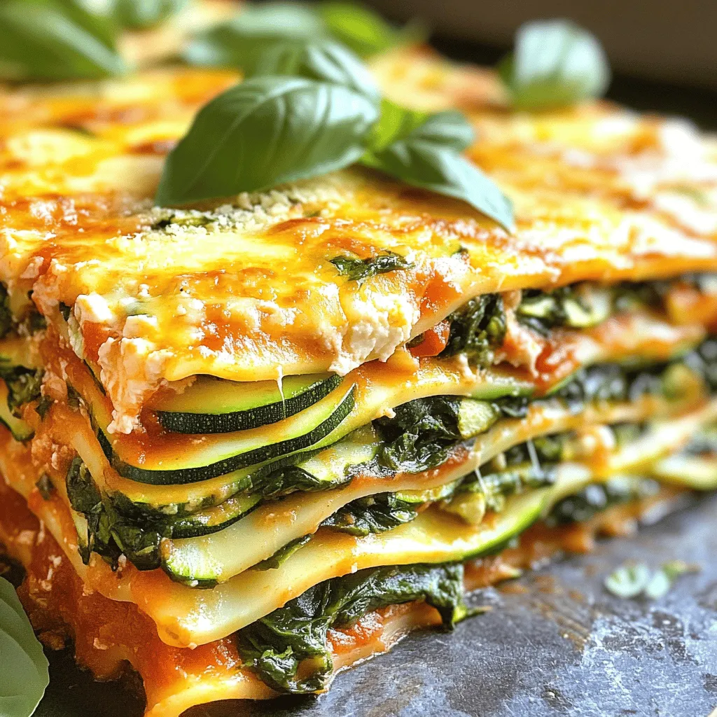 ![- 3 medium zucchinis, thinly sliced - 2 cups fresh spinach, packed - 15 oz ricotta cheese - 1 cup shredded mozzarella cheese - 1 cup grated Parmesan cheese - 1 large egg - 2 cups marinara sauce - 2 cloves garlic, minced - 1 teaspoon Italian seasoning - Salt and pepper to taste - Olive oil for cooking - Fresh basil leaves for garnish Zucchini and spinach make a great pair in this lasagna. You get the best of both worlds: a hearty dish that is also light and healthy. The zucchinis replace traditional pasta, which helps cut down on carbs. To start, gather your ingredients. Fresh zucchinis bring a crisp texture that holds up well in the oven. Spinach adds a vibrant green color and a healthy punch of nutrients. Ricotta cheese gives the dish creaminess. I love mixing it with an egg and some grated Parmesan. This blend helps bind the filling and adds depth. Marinara sauce brings a rich tomato flavor, while garlic and Italian seasoning enhance the taste even more. This recipe is easy to follow. You can find the Full Recipe in this article. Make sure to have all your ingredients ready before you start. Having everything prepped helps the cooking process go smoothly. Enjoy the colors and fresh scents as you prepare this tasty meal! - Preheat the oven to 375°F (190°C). - In a bowl, mix 15 oz of ricotta cheese, 1 large egg, and 1 cup of grated Parmesan cheese. Add 1 teaspoon of Italian seasoning, salt, and pepper to taste. Set this aside. - In a skillet, drizzle olive oil and heat over medium. Add 2 minced cloves of garlic and cook for about 1 minute until fragrant. - Toss in 2 cups of fresh spinach and cook until it wilts, about 2-3 minutes. Mix this into the ricotta mixture. - Start by spreading a thin layer of 2 cups of marinara sauce on the bottom of a baking dish. - Next, layer zucchini slices over the sauce. Use 3 medium zucchinis, thinly sliced. - Add half of the ricotta-spinach mixture on top of the zucchini. - Repeat with another layer of marinara sauce, more zucchini slices, and the rest of the ricotta-spinach mixture. - Finish with a final layer of zucchini, the remaining marinara sauce, and top it with 1 cup of shredded mozzarella cheese. - Cover the baking dish with aluminum foil and bake for 30 minutes. - Remove the foil and bake for an additional 15 minutes, or until the cheese bubbles and turns golden brown. - Let the lasagna cool for 10 minutes before slicing. This helps the layers set better. How to cut zucchini for optimal layering Cut zucchinis into thin slices. Aim for about 1/8 inch thick. This helps them cook well and blend in with the layers. You can use a sharp knife or a mandoline for even slices. Remember, even slices mean even cooking! Tips for seasoning the ricotta mixture Mix the ricotta cheese with one large egg and grated Parmesan. Add Italian seasoning, salt, and pepper. Taste it to adjust the flavor. If you want a kick, add a pinch of red pepper flakes. This step makes the ricotta rich and tasty. Best practices for sautéing spinach Heat olive oil in a skillet over medium heat. Add minced garlic and cook for about one minute. This makes your kitchen smell amazing! Then, add the fresh spinach. Cook until it wilts, about 2 to 3 minutes. Don't overcook—keep that vibrant green color! Recommended side dishes Serve your zucchini spinach lasagna with a fresh salad. A simple green salad with a light vinaigrette works great. Garlic bread also pairs well and adds a nice crunch. Best wines to pair with zucchini spinach lasagna A light red wine like Pinot Noir is perfect. If you prefer white, try a Chardonnay. Both wines enhance the flavors of the dish and make your meal feel special. Creative ways to use leftovers Leftover lasagna makes a quick lunch! You can also chop it up and mix it into a salad for a twist. Another idea is to bake it in a pie crust for a fun lunch option. For the full recipe, check out the [Full Recipe]. {{image_2}} If you want to change things up, you have great options. For the ricotta cheese, try cottage cheese or cream cheese. These swaps keep it creamy and delicious. You can also add different veggies. Consider mushrooms, bell peppers, or eggplant for added flavor. Mixing in these vegetables makes your lasagna colorful and fun. If you're gluten-free, use gluten-free lasagna noodles. You can also use thinly sliced zucchini as the noodle base. This keeps the dish light and healthy. To boost the taste, add spices like red pepper flakes or fresh herbs. Basil, oregano, or thyme can add depth to your dish. Just sprinkle them between the layers for extra flavor. You can use different cheeses for more richness. Try goat cheese or a sharp cheddar. Mixing cheeses creates a unique taste that you’ll love. Adjust your marinara sauce for more flavor. Add a splash of red wine or some chopped olives. This gives your sauce a special twist that makes it stand out. For the full recipe, check out the original instructions to see how all these ideas fit in. Store leftover zucchini spinach lasagna in an airtight container. Glass or plastic containers work well. Make sure to let it cool before sealing. The lasagna stays fresh in the fridge for up to three days. You can also freeze it. Wrap the lasagna tightly in plastic wrap and then in foil. It can last in the freezer for up to three months. When you're ready to eat it again, thaw it in the fridge overnight. To reheat lasagna, use an oven or microwave. Preheat the oven to 350°F (175°C). Cover the lasagna with foil to keep it moist. Heat for about 20 minutes or until warm. In the microwave, place a slice on a microwave-safe plate. Heat it for 2-3 minutes on high. Check to make sure it’s hot all the way through. This will help keep the texture and flavor intact. Enjoy your delicious zucchini spinach lasagna again! For a detailed guide, check the Full Recipe. Can I make zucchini spinach lasagna ahead of time? Yes, you can prepare the lasagna a day in advance. Assemble it, then cover it with foil. Store it in the f